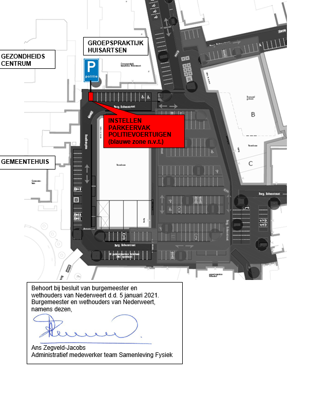 door het plaatsen van een bord model E8l Parkeerplaats politie (van bijlage I van het Reglement verkeersregels en verkeerstekens 1990) het op bijbehorende tekening nader aangegeven parkeervak aan de Burgemeester Hobusstraat in Nederweert, uitsluitend als parkeerplaats voor politievoertuigen aan te wijzen;