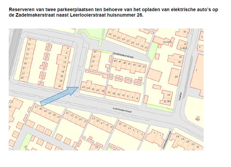 twee parkeerplaatsen te reserveren op de Zadelmakerstraat naast Leerlooierstraat huisnummer 26 uitsluitend ten behoeve van het opladen van elektrische auto’s;