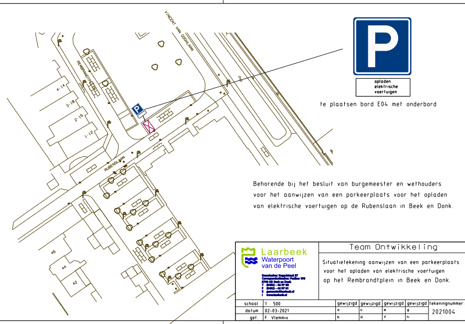 Gemeente Laarbeek - verkeersbesluit - aanwijzen van een parkeerplaats voor opladen van elektrische voertuigen - Rubenslaan, Beek en Donk