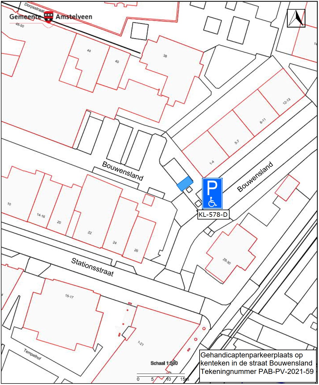 Burgemeester en wethouders van Amstelveen besluiten het parkeren te verbieden op een parkeerplaats in de straat Bouwensland, zoals aangegeven op tekening PAB-PV-2021-59, met uitzondering van het voertuig met het kenteken KL-578-D (gehandicaptenparkeerplaats).