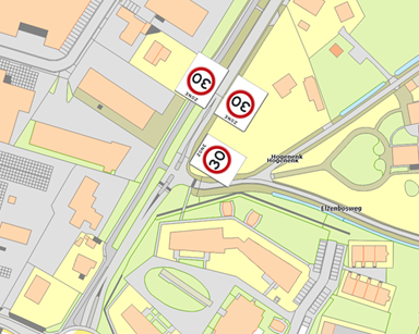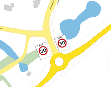- er zijn geen poorten of uitritconstructies aangebracht die de overgang weergeven tussen de verschillende geldende maximumsnelheden (van 50 naar 30 en van 30 naar 50 km/uur);