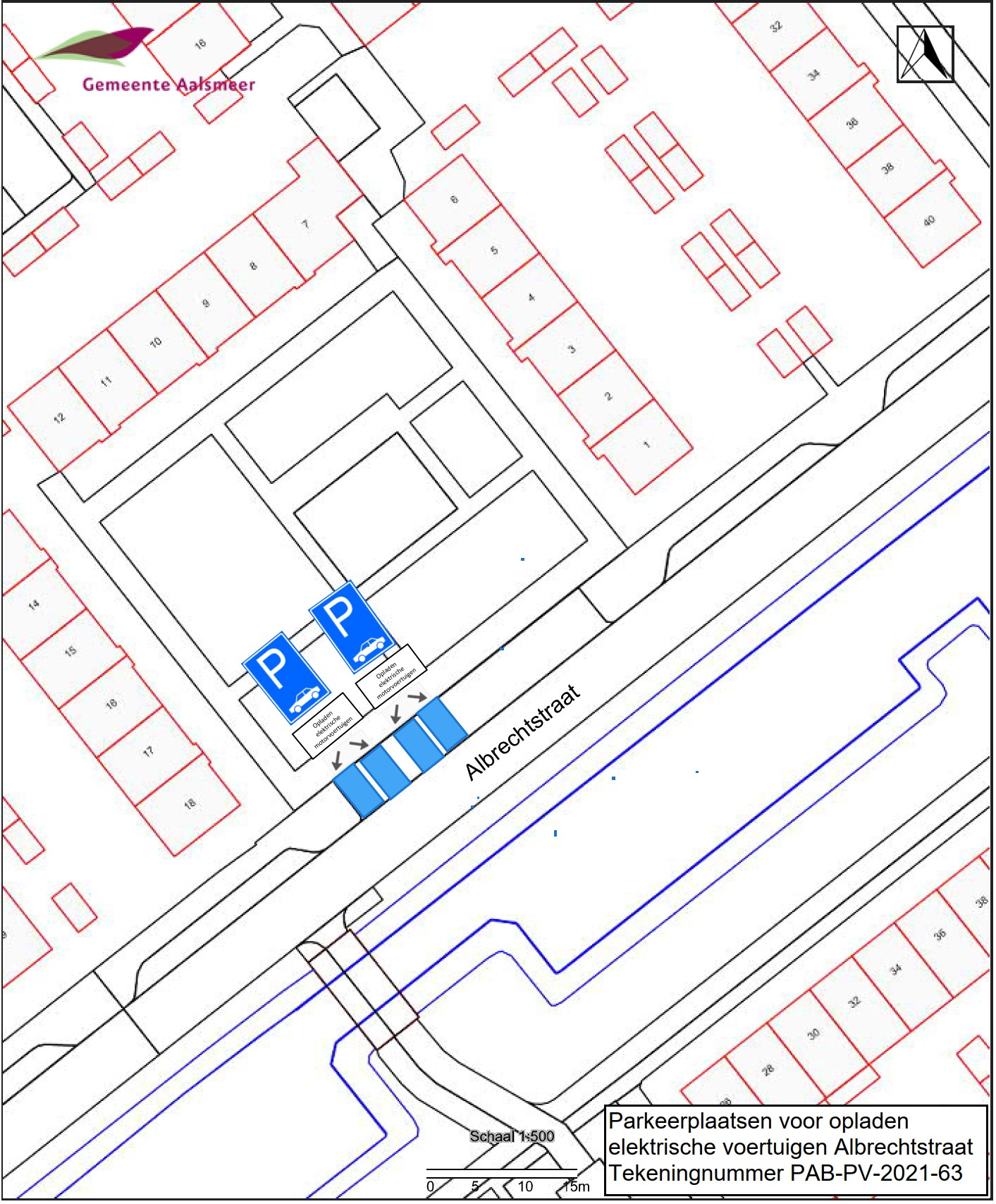 Burgemeester en wethouders van Aalsmeer besluiten om in de Albrechtstraat vier parkeerplaatsen aan te wijzen als parkeerplaats voor het opladen van elektrische motorvoertuigen. De parkeerplaatsen mogen alleen gebruikt worden voor het opladen van deze elektrische motorvoertuigen.
