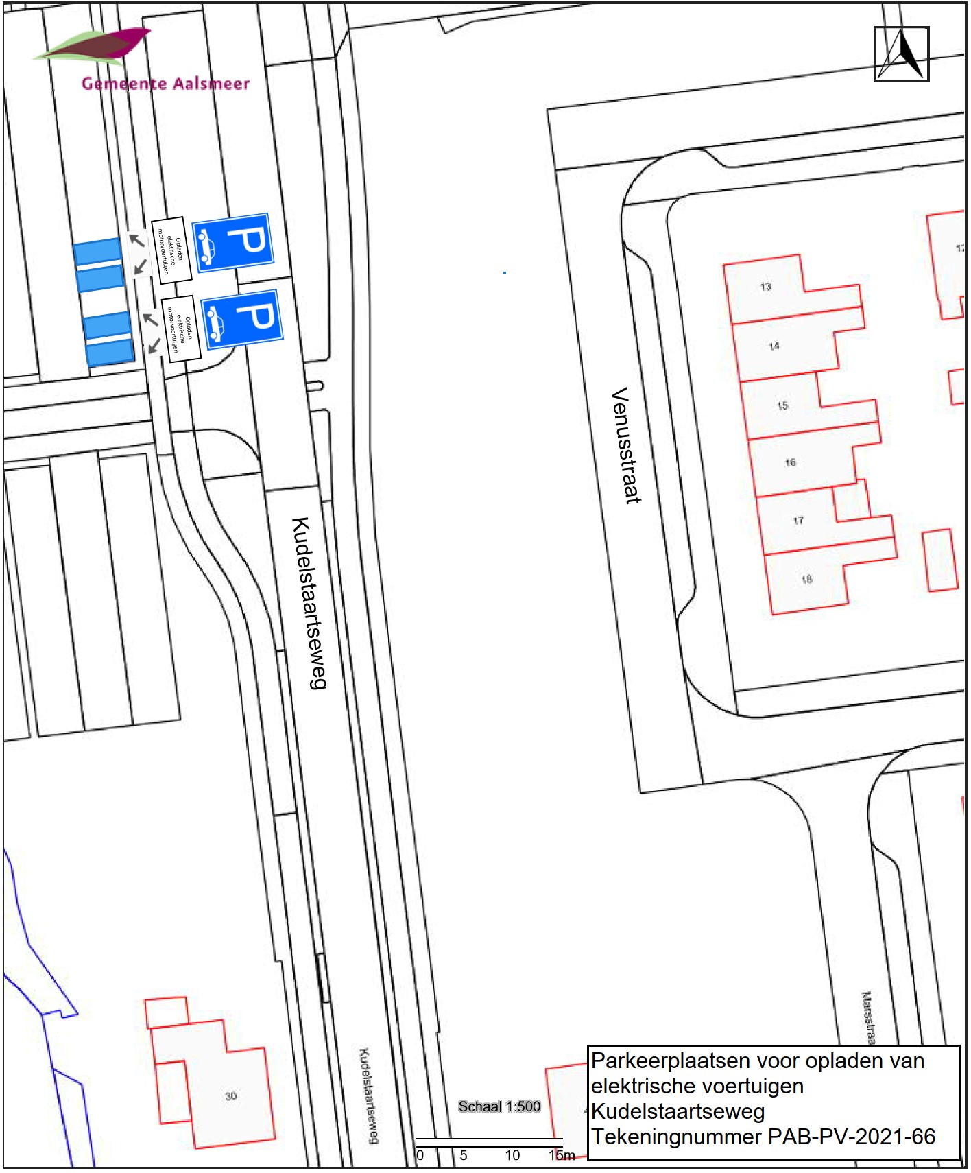 Burgemeester en wethouders van Aalsmeer besluiten om op de Kudelstaartseweg vier parkeerplaatsen aan te wijzen als parkeerplaats voor het opladen van elektrische motorvoertuigen. De parkeerplaatsen mogen alleen gebruikt worden voor het opladen van deze elektrische motorvoertuigen.