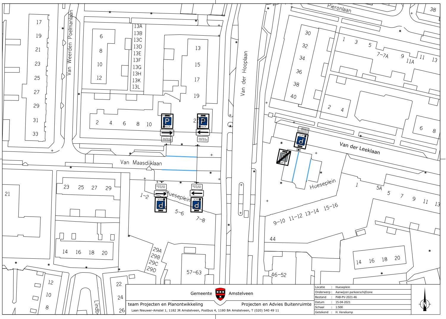 Burgemeester en wethouders van Amstelveen besluiten om de parkeerplaatsen op het gedeelte van het Hueseplein ten zuiden van de Van der Leeklaan voor de panden Hueseplein 9 tot en met 15 en de parkeerplaatsen aan weerszijden van de Van Maasdijklaan voor de panden Hueseplein 1 tot en met 8 aan te wijzen als parkeerschijfzone.