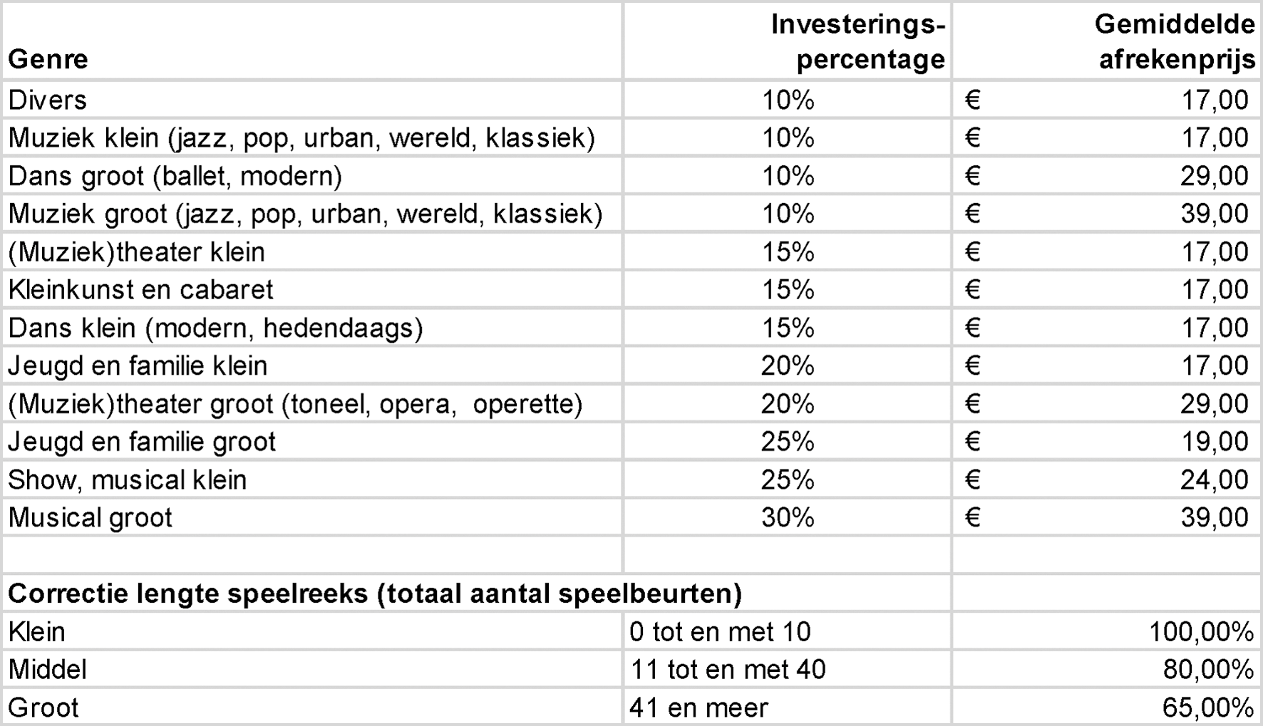 c. vermenigvuldigd met het investeringspercentage voor het betreffende genre zoals opgenomen in bijlage A.