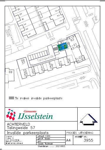 Overwegende dat door een bewoner van Talingweide 57 het verzoek is gedaan om een parkeerverbod ten behoeve van een gehandicaptenparkeerplaats in te stellen op een van de openbare parkeerplaatsen gelegen nabij het perceel Talingweide 57 te IJsselstein waarbij het parkeerverbod niet van toepassing is op de houder van de personenauto waarvan het kenteken overeenkomt met het kenteken op het onderbord van de gehandicaptenparkeerplaats;