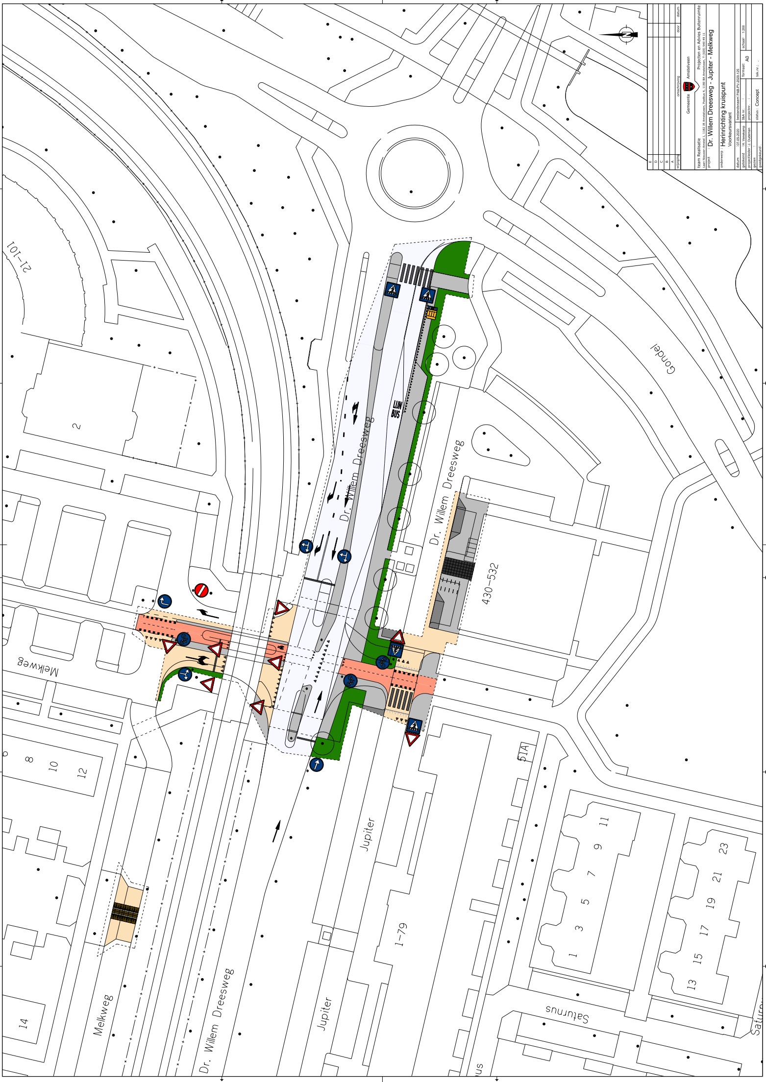 De Dr. Willem Dreesweg wordt tussen de kruising en de rotonde verlegd waarbij de beide rijstroken fysiek van elkaar worden gescheiden. Hierdoor kunnen er opstelvakken worden gemaakt naar het parkeerterrein aan de Melkweg en wordt er opstelruimte gecreëerd voor fietsers en voetgangers van Jupiter naar Melkweg, waardoor zij de Dr. Willem Dreesweg veiliger kunnen oversteken. Voor Jupiter betekent dit dat het zuidelijke deel van de kruising voor de afwikkeling van motorvoertuigen komt te vervallen en wordt heringericht als verplicht fietspad. Op het noordelijke deel van de kruising splitst het doorgetrokken fietspad de ontsluiting van en naar het parkeerterrein voor motorvoertuigen in een in- en uitrit, die elk aan weerszijden van dat fietspad liggen. Dat is alleen mogelijk met het instellen van eenrichtingsverkeer, waarbij de inrit aan de oostkant van het fietspad ligt en de uitrit aan de westkant daarvan.