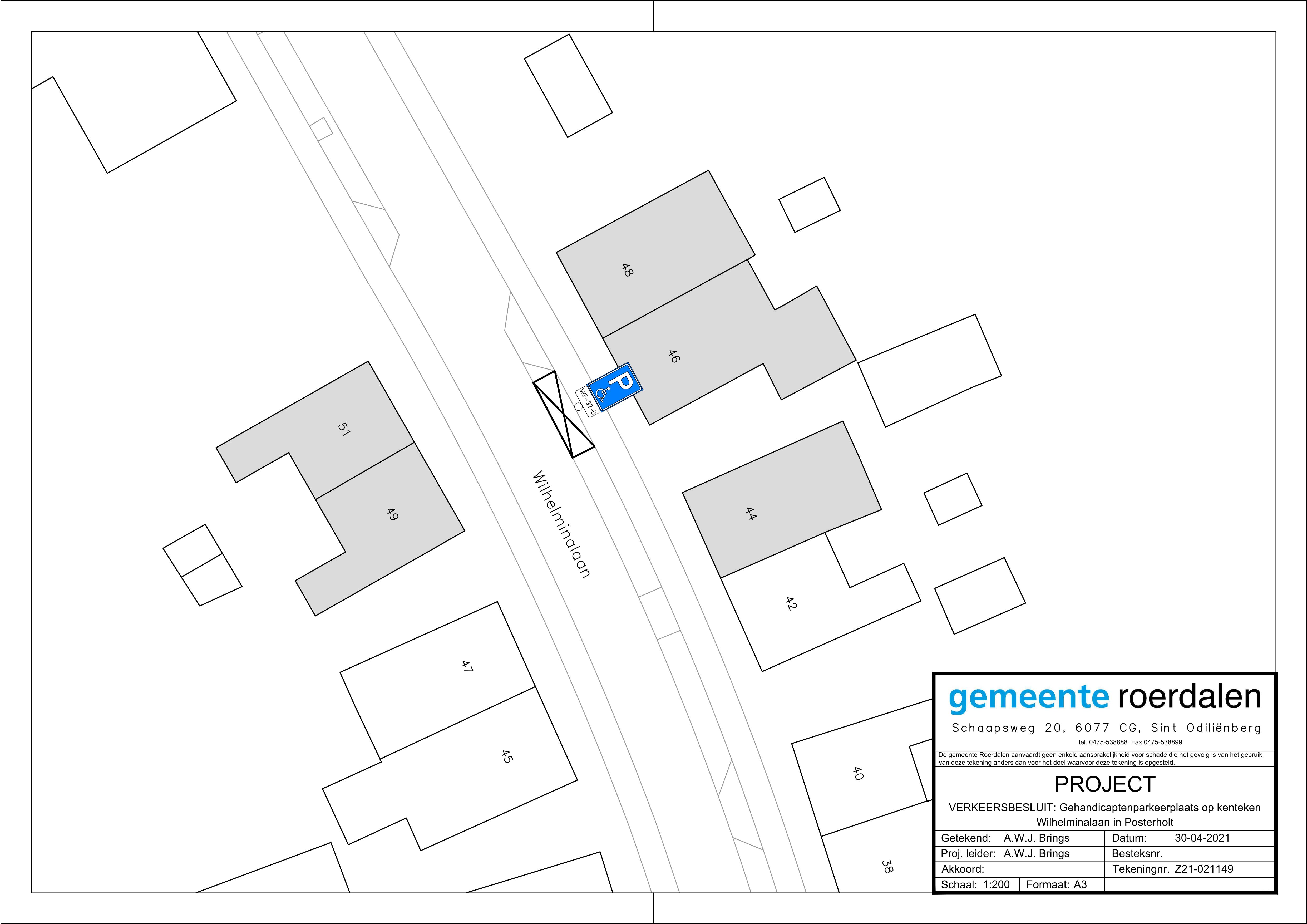 De gehandicaptenparkeerplaats op kenteken wordt gerealiseerd door het plaatsen van het verkeersbord E6 (RVV 1990) en het aanbrengen van ondersteunende markering op de rijbaan in de directe nabijheid van desbetreffende woning aan de Wilhelminalaan in Posterholt. Uitvoering conform situatietekening Z21-021149.