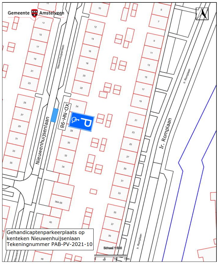 Burgemeester en wethouders van Amstelveen besluiten het parkeren te verbieden op een parkeerplaats in de Nieuwenhuijsenlaan, zoals aangegeven op tekening PAB-PV-2021-10, met uitzondering van het voertuig met het kenteken XD-NH-98 (gehandicaptenparkeerplaats).