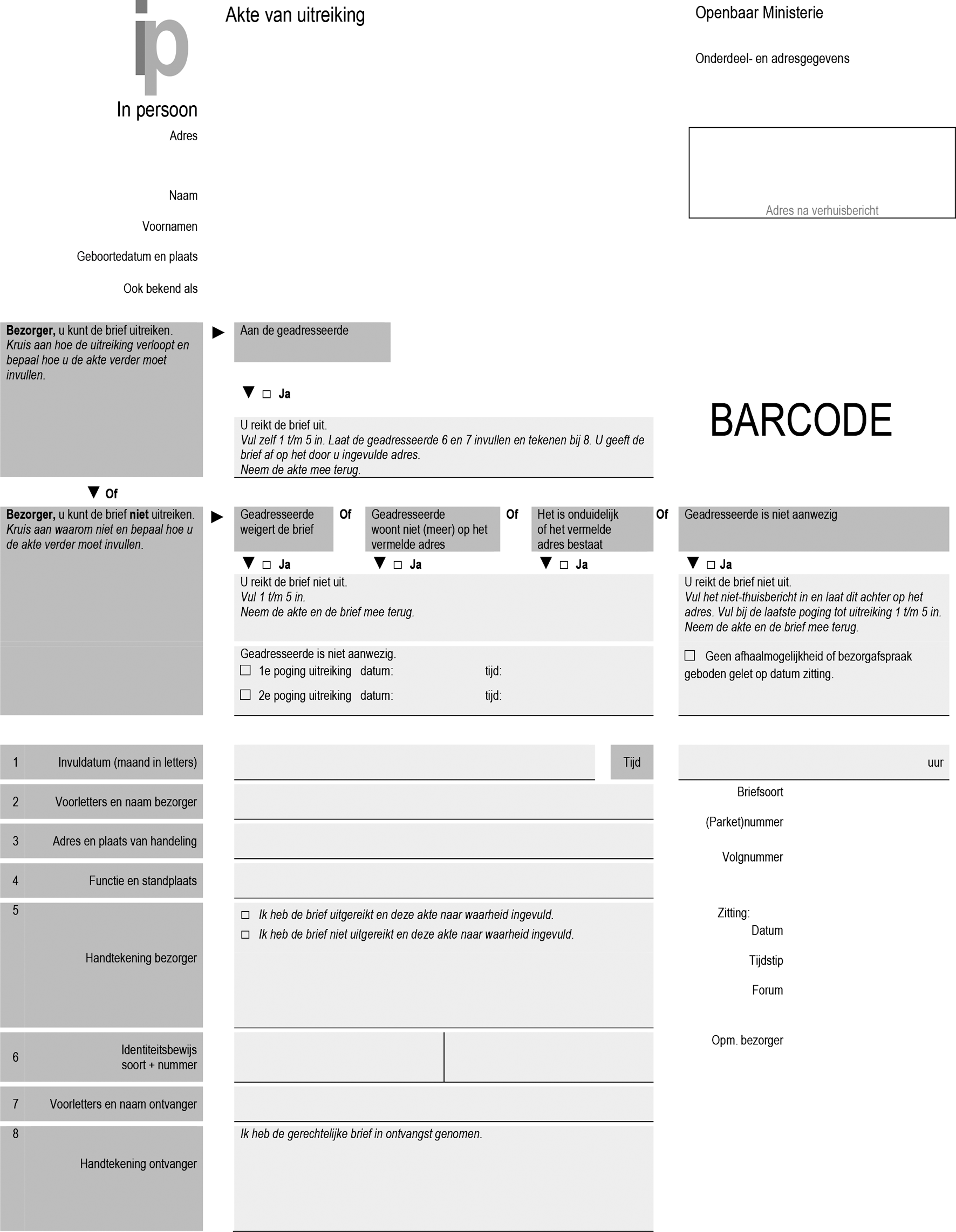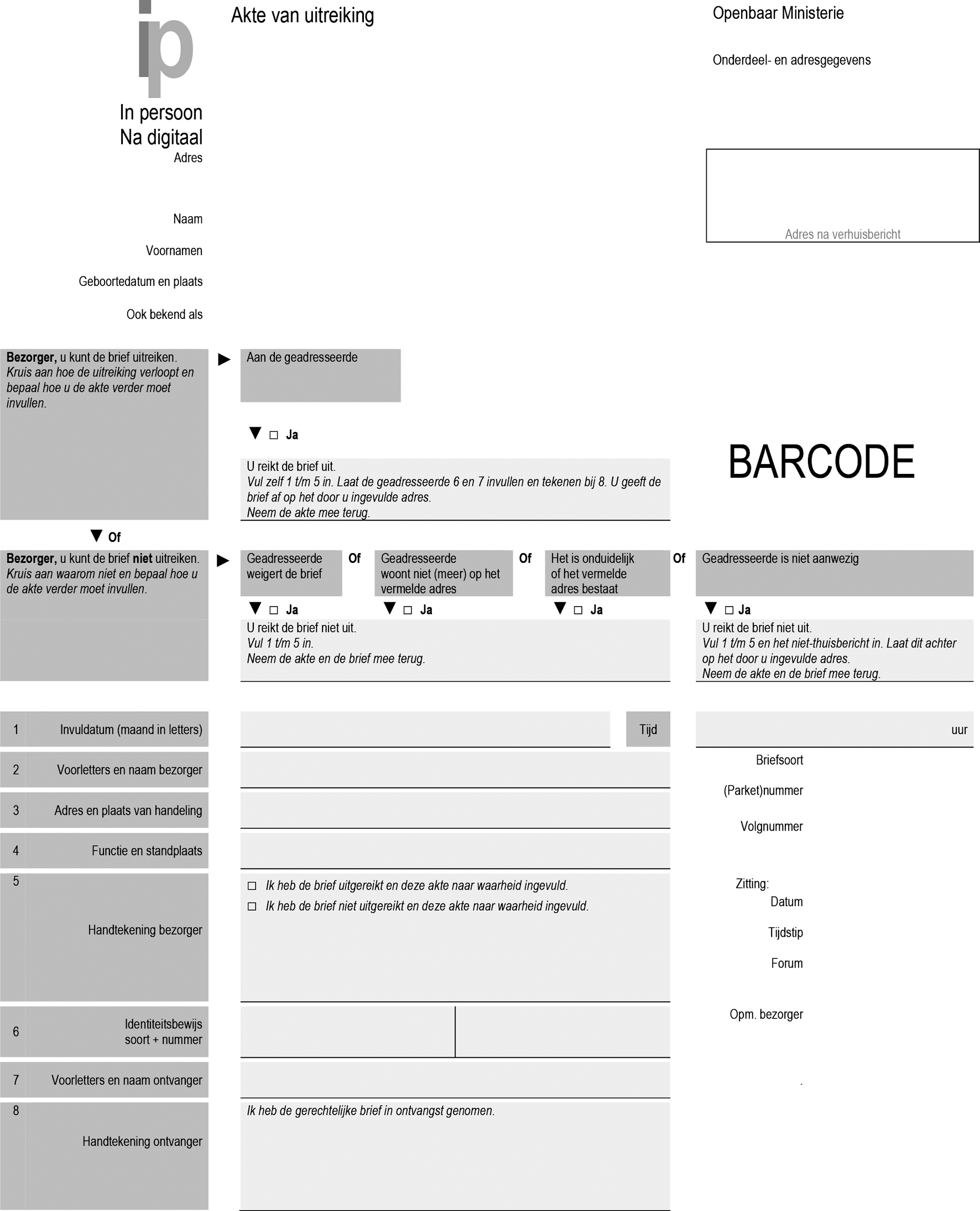Het model ‘Akte van uitreiking IP’ betreft de modelakte voor de uitreiking in persoon ex artikel 36e, eerste lid, onderdeel b, Sv. Er wordt driemaal getracht de betekening door de geadresseerde in persoon te laten plaatsvinden. Lukt dat niet, dan wordt een niet-thuisbericht achtergelaten. Wanneer de uitreiking niet is gelukt wordt de gerechtelijke mededeling uitgereikt aan de autoriteit van welke zij is uitgegaan, krachtens artikel 36e, tweede lid, onderdeel b, Sv.