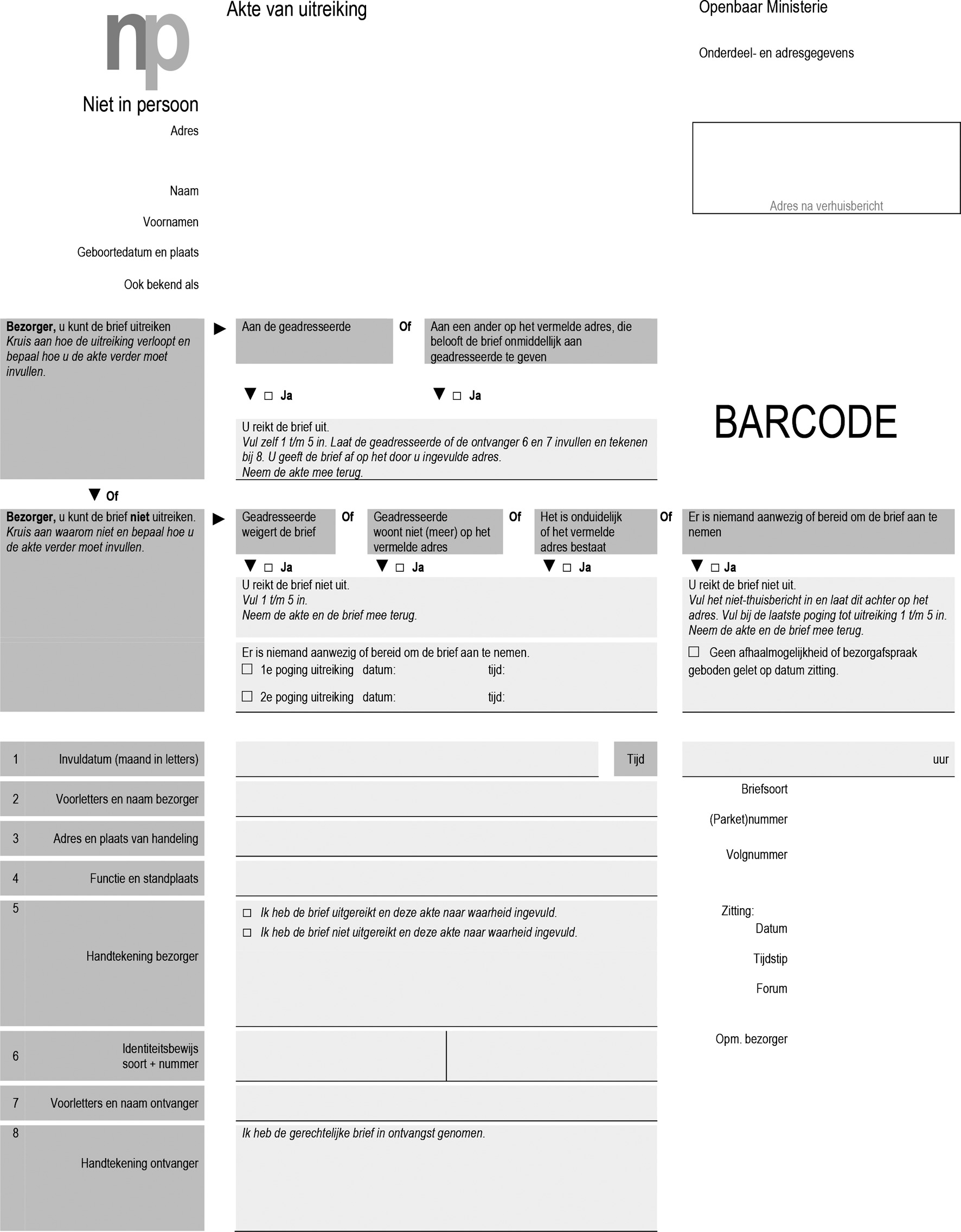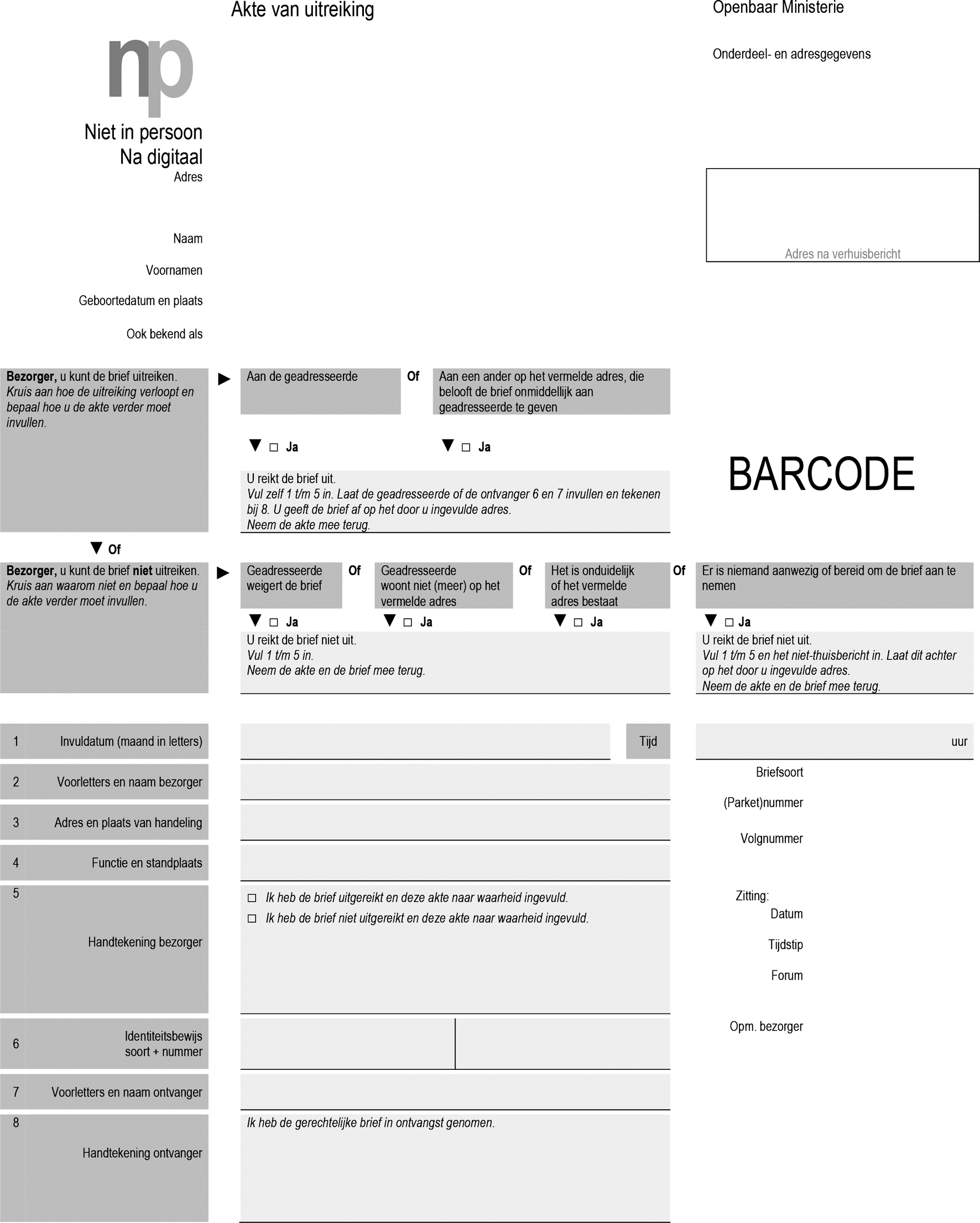 Het model ‘Akte van uitreiking NP’ betreft de modelakte voor de uitreiking niet in persoon ex artikel 36e, tweede lid, onderdeel a, Sv. Er wordt driemaal getracht de betekening door de geadresseerde in persoon te laten plaatsvinden. Lukt dat niet, dan wordt een niet-thuisbericht achtergelaten. Wanneer de uitreiking niet is gelukt wordt de gerechtelijke mededeling uitgereikt de aan autoriteit van welke zij is uitgegaan krachtens artikel 36e, tweede lid, onderdeel b, Sv.
