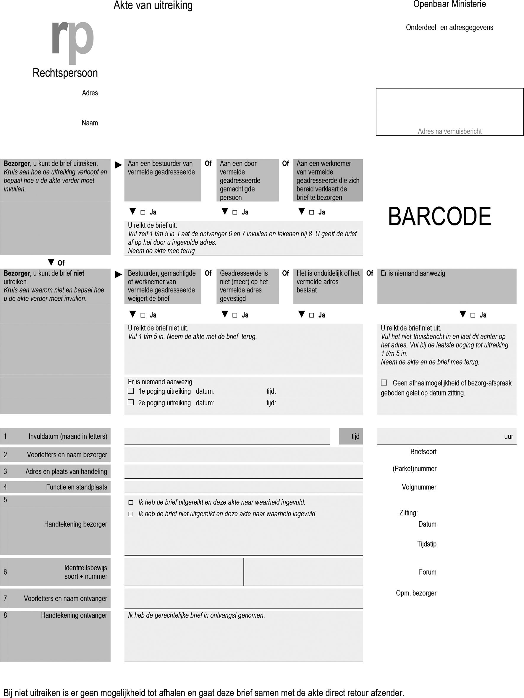 Het model ‘Akte van uitreiking RP’ betreft de modelakte voor de uitreiking aan de bestuurder, de gemachtigde of de werknemer van een rechtspersoon ex artikel 36j Sv. Er wordt driemaal getracht de betekening door de geadresseerde in persoon te laten plaatsvinden. Lukt dat niet, dan wordt een niet-thuisbericht achtergelaten. Wanneer de uitreiking niet is gelukt wordt de gerechtelijke mededeling uitgereikt aan de autoriteit van welke zij is uitgegaan krachtens artikel 36l Sv.