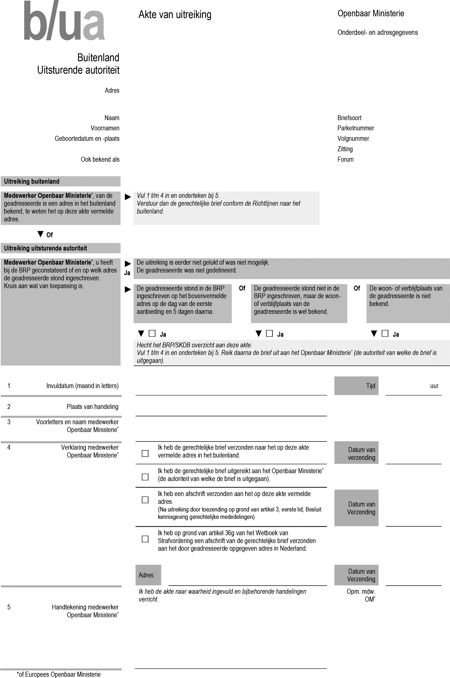 Het model ‘Akte van uitreiking B/UA’ bevat de modelakte voor de uitreiking aan een autoriteit in het buitenland in gevallen waarin de woon- of verblijfplaats van de geadresseerde in het buitenland bekend is ex artikel 36e, derde lid, Sv, en voor de uitreiking aan de autoriteit van welke zij is uitgegaan in de gevallen waarin uitreiking niet heeft kunnen geschieden ex artikel 36e, tweede lid, onderdeel b, Sv.