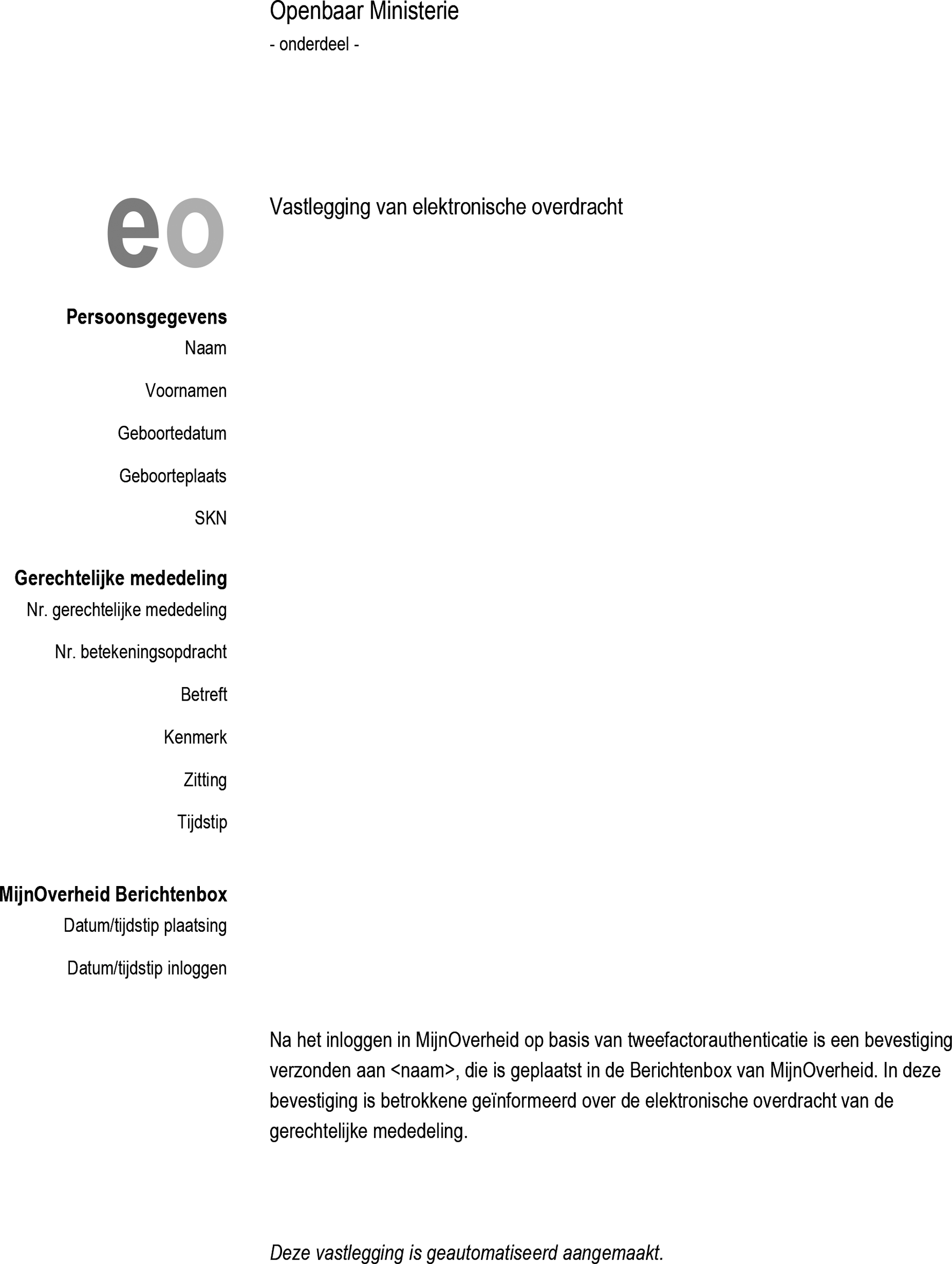 Het model ‘Vastlegging van elektronische overdracht’ bevat het model voor een automatisch aan te maken bericht in MijnOverheid wanneer de geadresseerde in dat systeem heeft aangegeven post van de autoriteit van welke de gerechtelijke mededeling uitgaat, digitaal te willen ontvangen krachtens artikelen 36b, tweede lid, en 36i, eerste lid, Sv. Aangezien de geadresseerde geen handtekening kan plaatsen, wordt de gerechtelijke mededeling als betekend beschouwd wanneer de geadresseerde zich met tweefactorauthenticatie toegang verschaft heeft tot MijnOverheid. In geval de geadresseerde dat niet tijdig doet, wordt overgegaan tot een uitreiking door middel van het model ‘Akte van uitreiking IP na digitaal’ of het model ‘Akte van uitreiking NP na digitaal’.