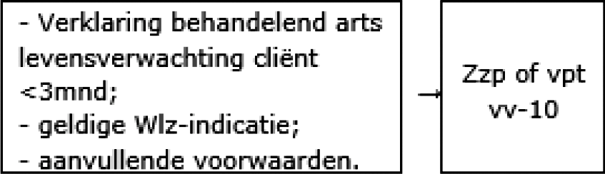 Het is alleen mogelijk om de prestatie vpt of zzp vv-10 te declareren wanneer de cliënt beschikt over een Wlz-indicatie. De zorgaanbieder kan, tot het overlijden van de cliënt of tot er geen sprake meer is van een terminale fase, de prestaties vpt of zzp vv-10 declareren.