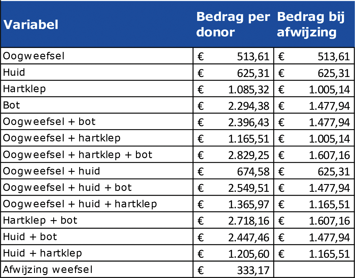 Omdat de uitname-organisatie alle noodzakelijke post mortem uitnames voor haar rekening neemt is er geen noodzaak een beschikbaarheidbijdrage te verstrekken aan een tweede organisatie om hartkleppen en bot-, huid-, oog- en peesweefsel beschikbaar te houden.