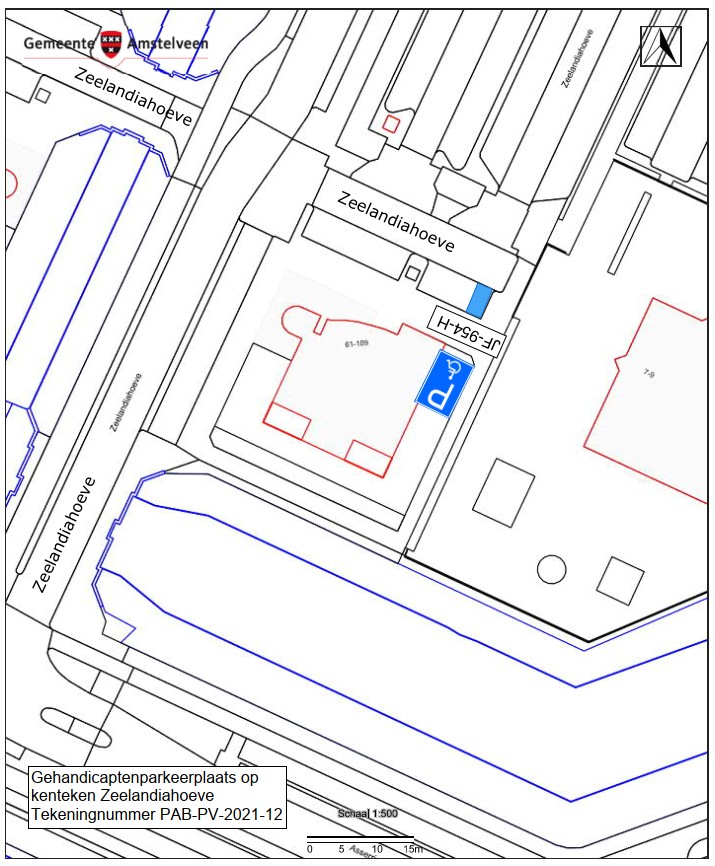 Burgemeester en wethouders van Amstelveen besluiten het parkeren te verbieden op een parkeerplaats op Zeelandiahoeve, zoals aangegeven op tekening PAB-PV-2021-12, met uitzondering van het voertuig met het kenteken JF-954-H (gehandicaptenparkeerplaats).
