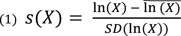2. Vervolgens worden van die log-getransformeerde waarden voor kenmerk (X) het gemiddelde (ln(X)) en de standaard deviatie SD(ln(X)) berekend.