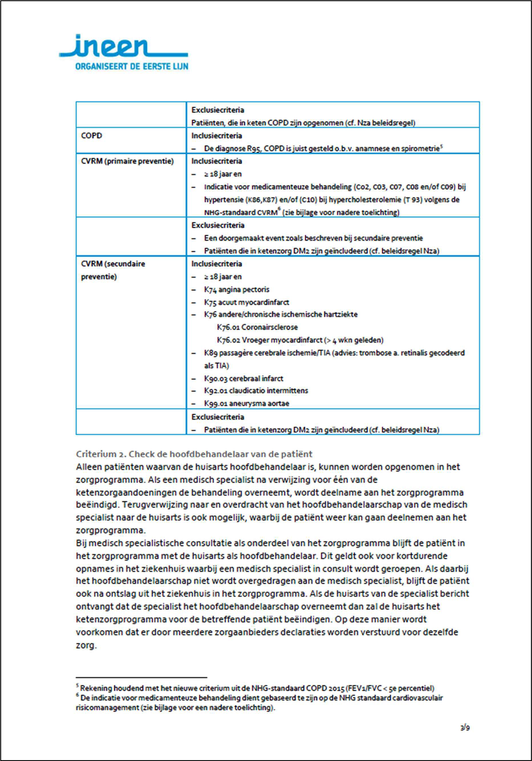– Bij DM2: alle kosten van diabetesteststrips, spleetlamponderzoek door of onder verantwoordelijkheid van de huisarts, instellen op insuline en structurele diabetesbegeleiding; en tevens kosten voor consulten en visites en dergelijke die samenhangen met de DM2-aandoening van de patiënt. Ook biedt het vergoeding voor het geheel aan huisartsenzorg aan HVZ-patiënten in de DM2-keten, inclusief alle kosten voor Doppleronderzoek en 24-uursbloeddrukonderzoek; en tevens kosten voor ECG maken, ECG-diagnostiek en consulten en visites en dergelijke die samenhangen met de HVZ-aandoening van de patiënt.