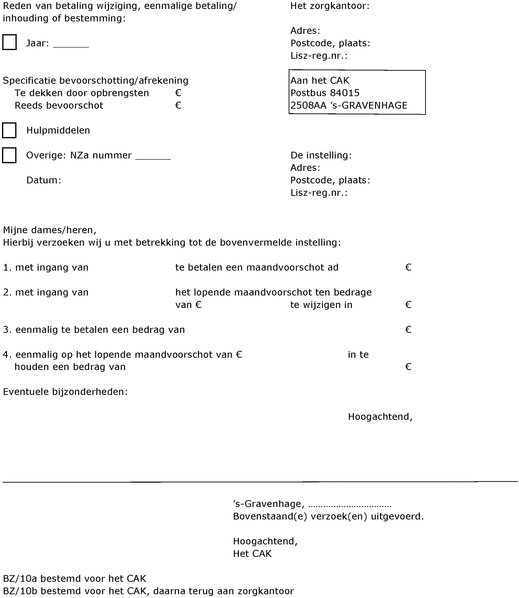De zorgkantoren maken voor het geven van een betaalopdracht aan het CAK gebruik van het digitale formulier BZ/10 (bijlage). Het is de bedoeling dat dit formulier binnenkort met behulp van een elektronische standaard wordt uitgewisseld.
