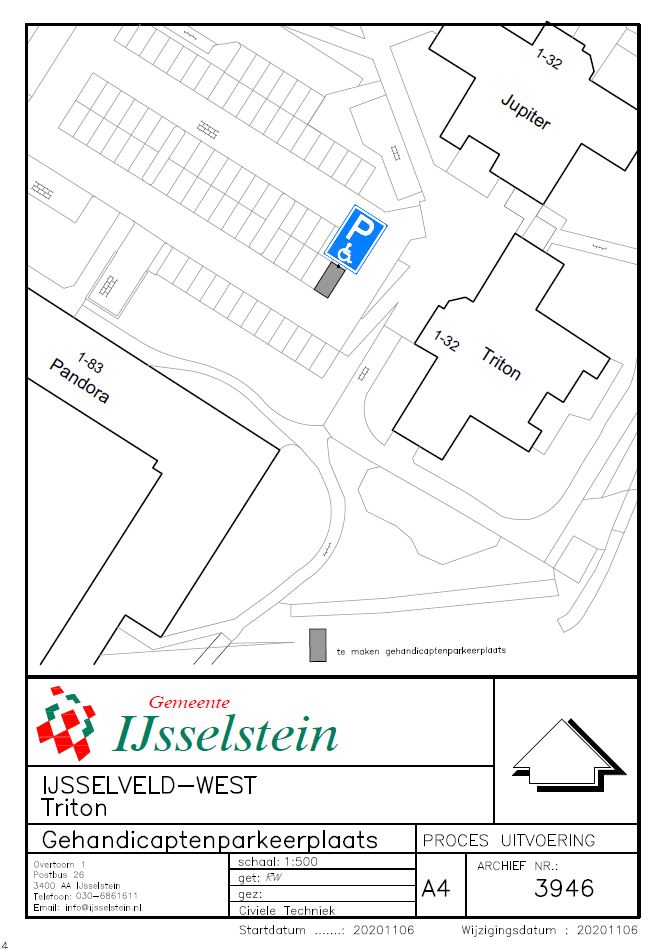 Overwegende dat door een bewoner van Triton 20 het verzoek is gedaan om een parkeerverbod ten behoeve van een gehandicaptenparkeerplaats in te stellen op een van de openbare parkeerplaatsen gelegen nabij het perceel Triton te IJsselstein waarbij het parkeerverbod niet van toepassing is op de houder van de personenauto waarvan het kenteken overeenkomt met het kenteken op het onderbord van de gehandicaptenparkeerplaats;