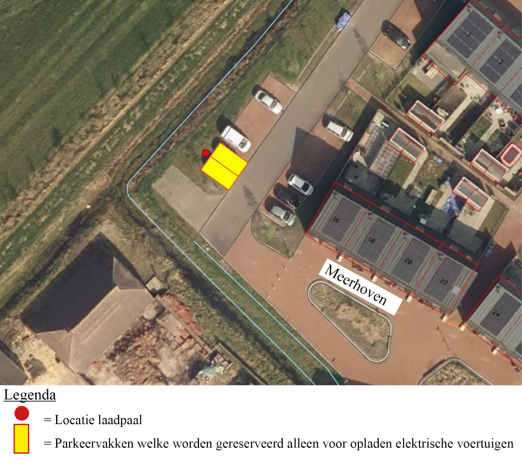 Wij besluiten op grond van bovenvermelde overwegingen twee parkeervakken, bij de laadpaal bij de parkeervakken ten westen van Meerhoven 16, aan te wijzen als parkeervakken alleen voor opladen elektrische voertuigen middels plaatsing van bord E4 uit bijlage 1 van het RVV 1990 met een onderbord met daarop de tekst ‘alleen voor opladen elektrische voertuigen’ alsmede pijlen, waaruit blijkt dat het bord voor twee parkeervakken van toepassing is.
