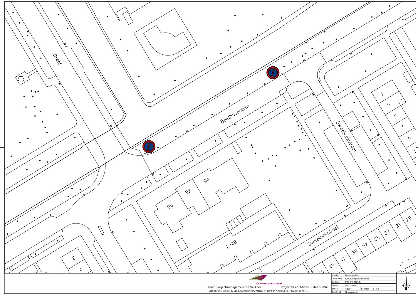 Burgemeester en wethouders van Aalsmeer besluiten om aan de noordkant van het gedeelte van de Beethovenlaan tussen de Dreef en de Sweelinckstraat een parkeerverbod in te stellen, zoals aangegeven op tekening PAB-PV-2021-04.