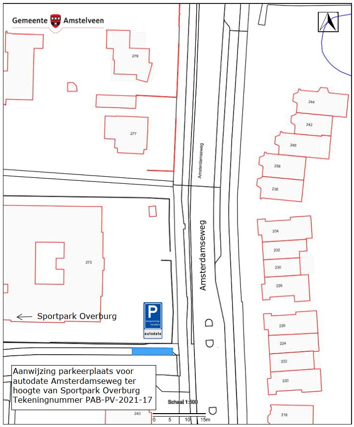 Burgemeester en wethouders van Amstelveen besluiten om op de Amsterdamseweg bij de toegang naar het sportpark Overburg een parkeerplaats aan te wijzen als belanghebbendenplaats voor het parkeren door vergunninghouders voor autodate.