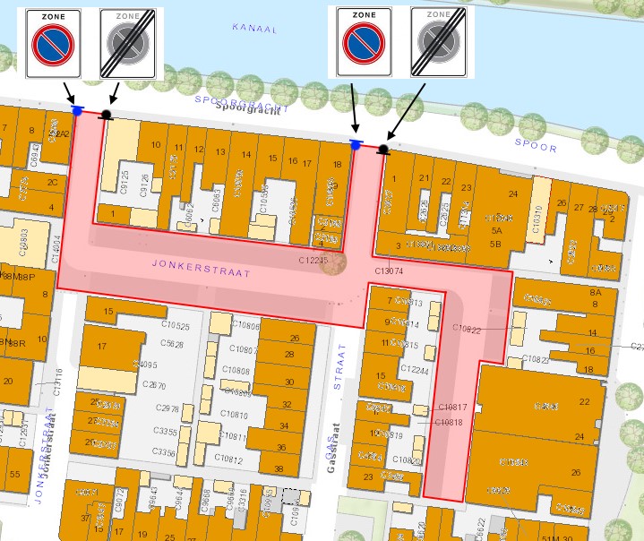 De Jonkerstraat en Gasstraat zijn aanliggende woonstraten in de Visbuurt. Het betreft het noordelijke deel van de Jonkerstraat en Gasstraat, ten noorden van de voetgangersgebieden. Op de Jonkerstraat wordt door middel van gele onderbroken lijnen op trottoirbanden aangegeven waar niet geparkeerd mag worden in deze straten. De gele onderbroken lijnen slijten na verloop van tijd weg, waardoor er onduidelijke situaties kunnen ontstaan wat betreft parkeren. Daarnaast kan er niet goed gehandhaafd worden op de situatie wanneer er slijtage ontstaat. In de Gasstraat geldt geen parkeerverbod. Er is gekeken naar een oplossing die beter past bij de inrichting van de straten. Na samenspraak met gemeente en politie is besloten dat een parkeerverbodszone de situatie in de Jonkerstraat en Gasstraat wat betreft parkeren duidelijker maakt.