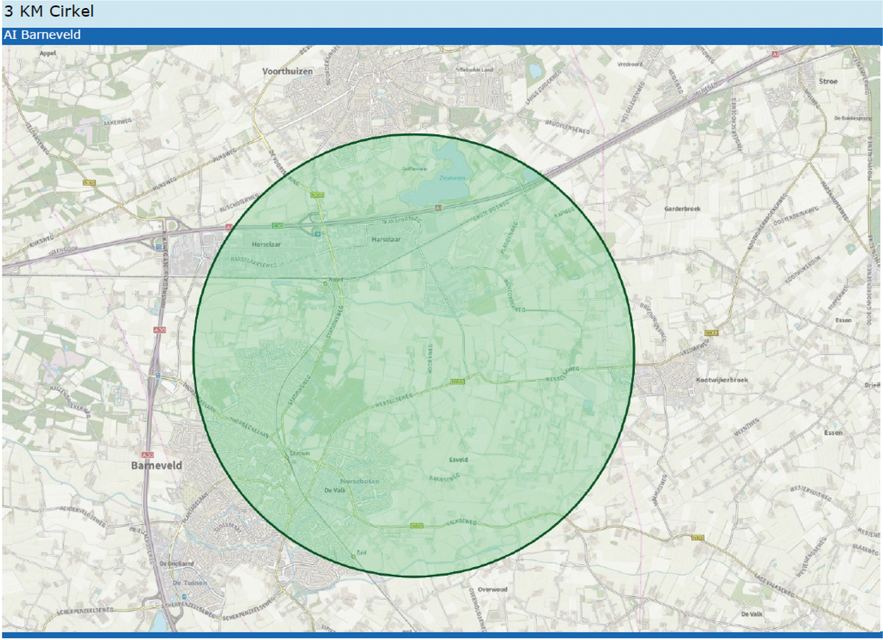 beschermings- en bewakingszone rond de besmette inrichting in Barnveld. In deze gebieden