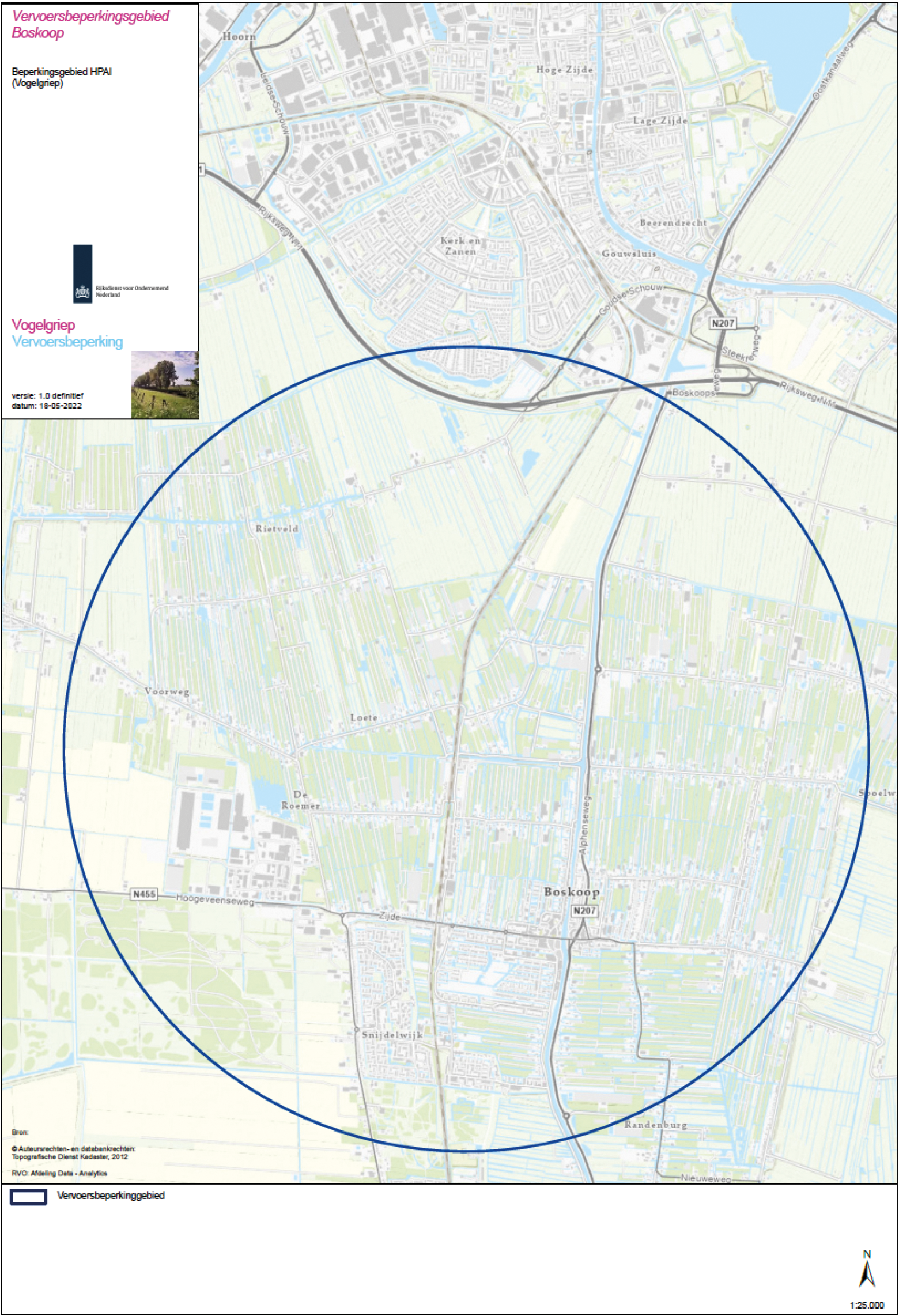beschermings- en bewakingszone rond de besmette inrichting in Boskoop. In deze gebieden