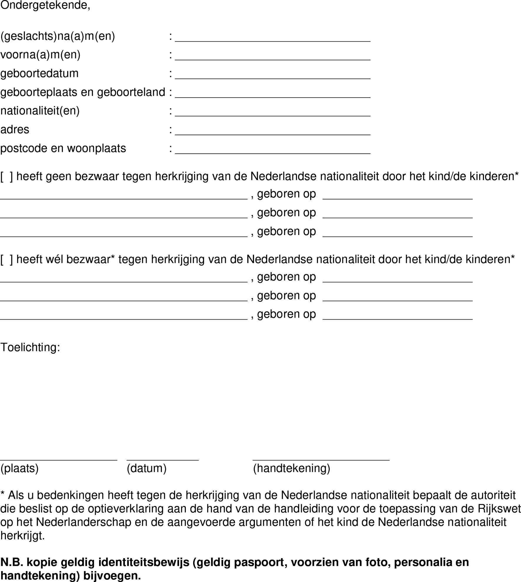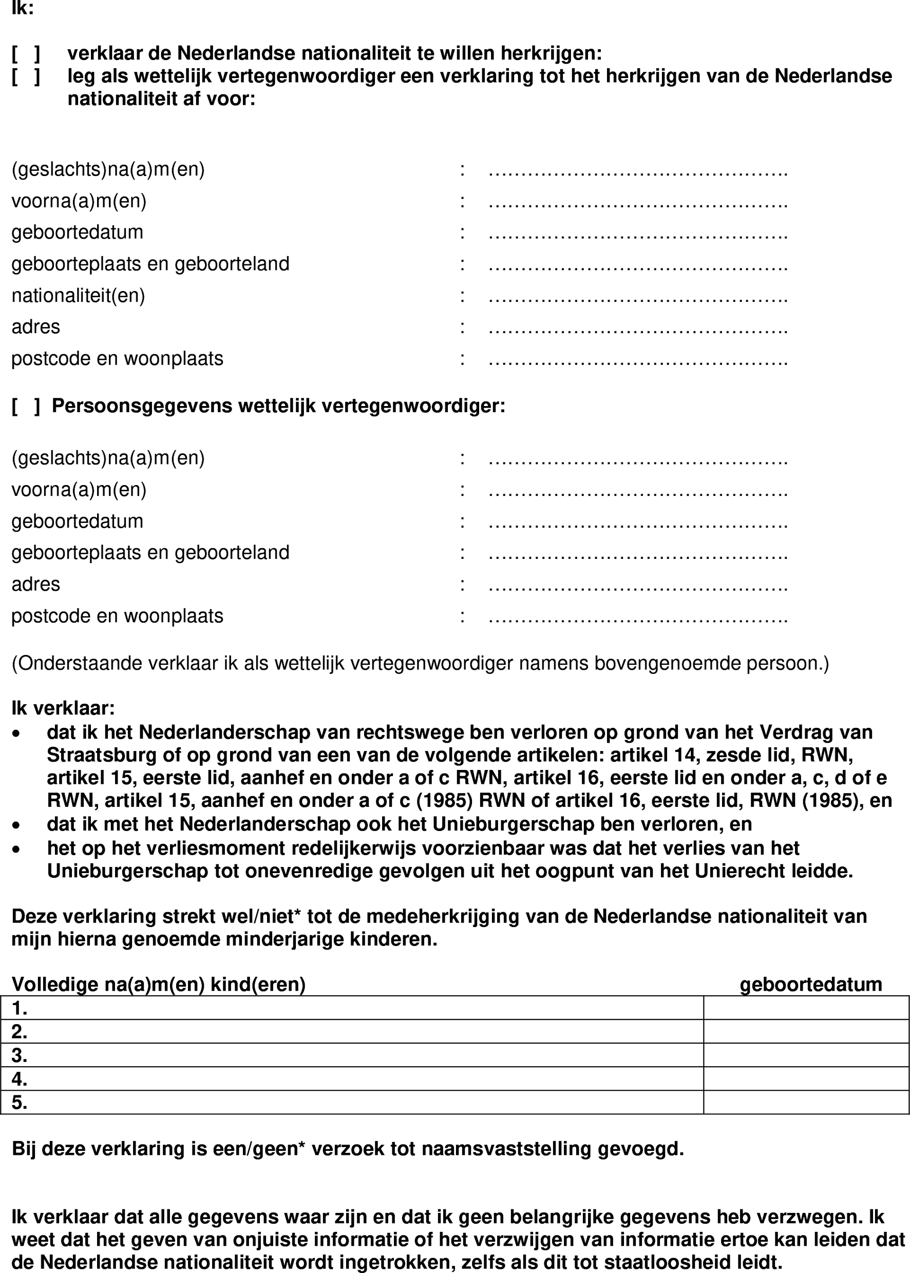 Van de verzoeker om naturalisatie wordt verlangd dat hij het mogelijke doet om zijn oorspronkelijke nationaliteit te verliezen dan wel zich bereid verklaart om na de totstandkoming van de naturalisatie het mogelijke te zullen doen om die nationaliteit te verliezen (artikel 9, eerste lid, aanhef en onder b, RWN). Dit is alleen anders als iemand valt onder een van de uitzonderingscategorieën (zie de toelichting bij artikel 9, eerste lid, aanhef en onder b, RWN).