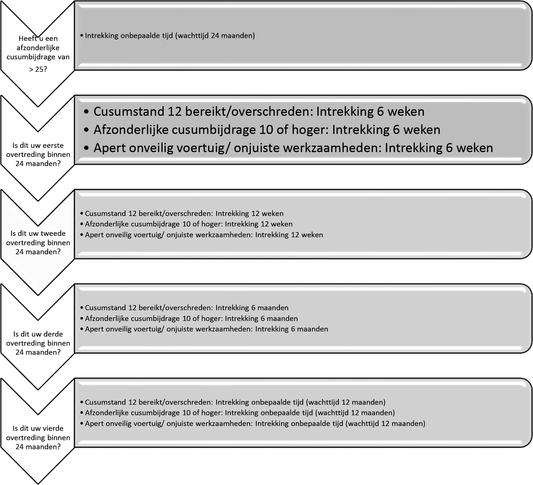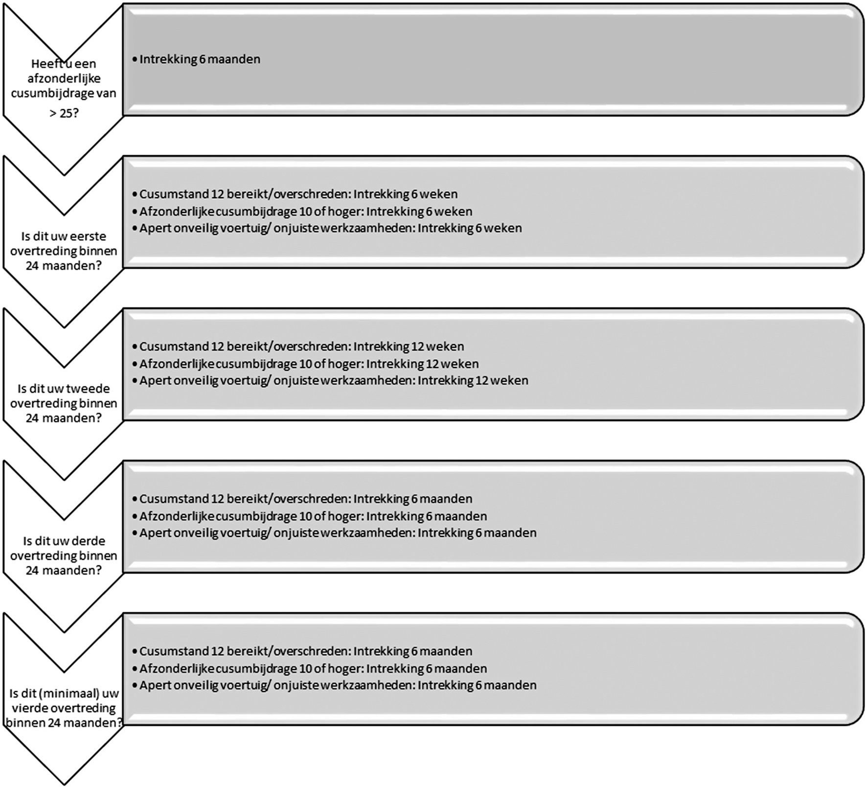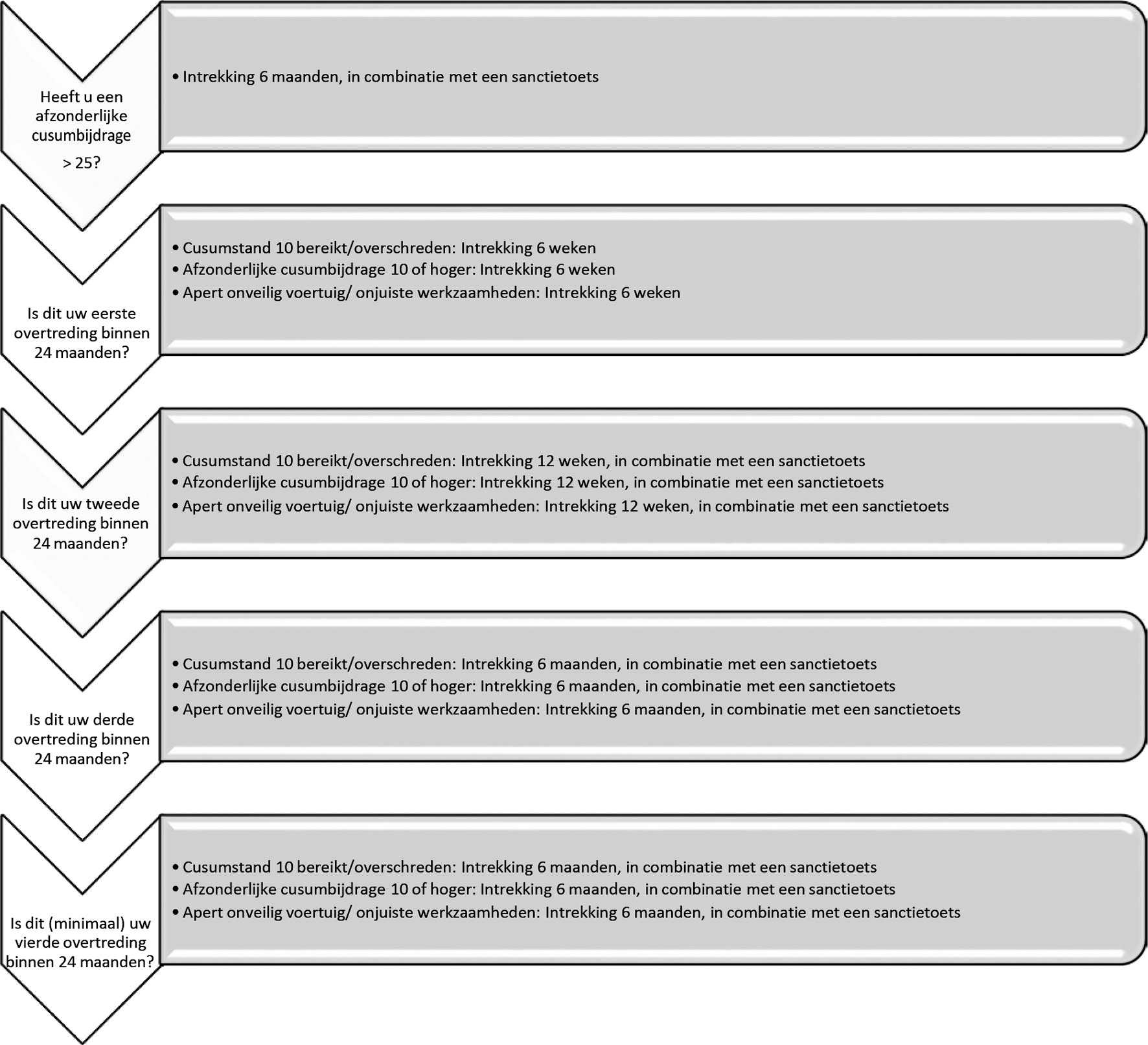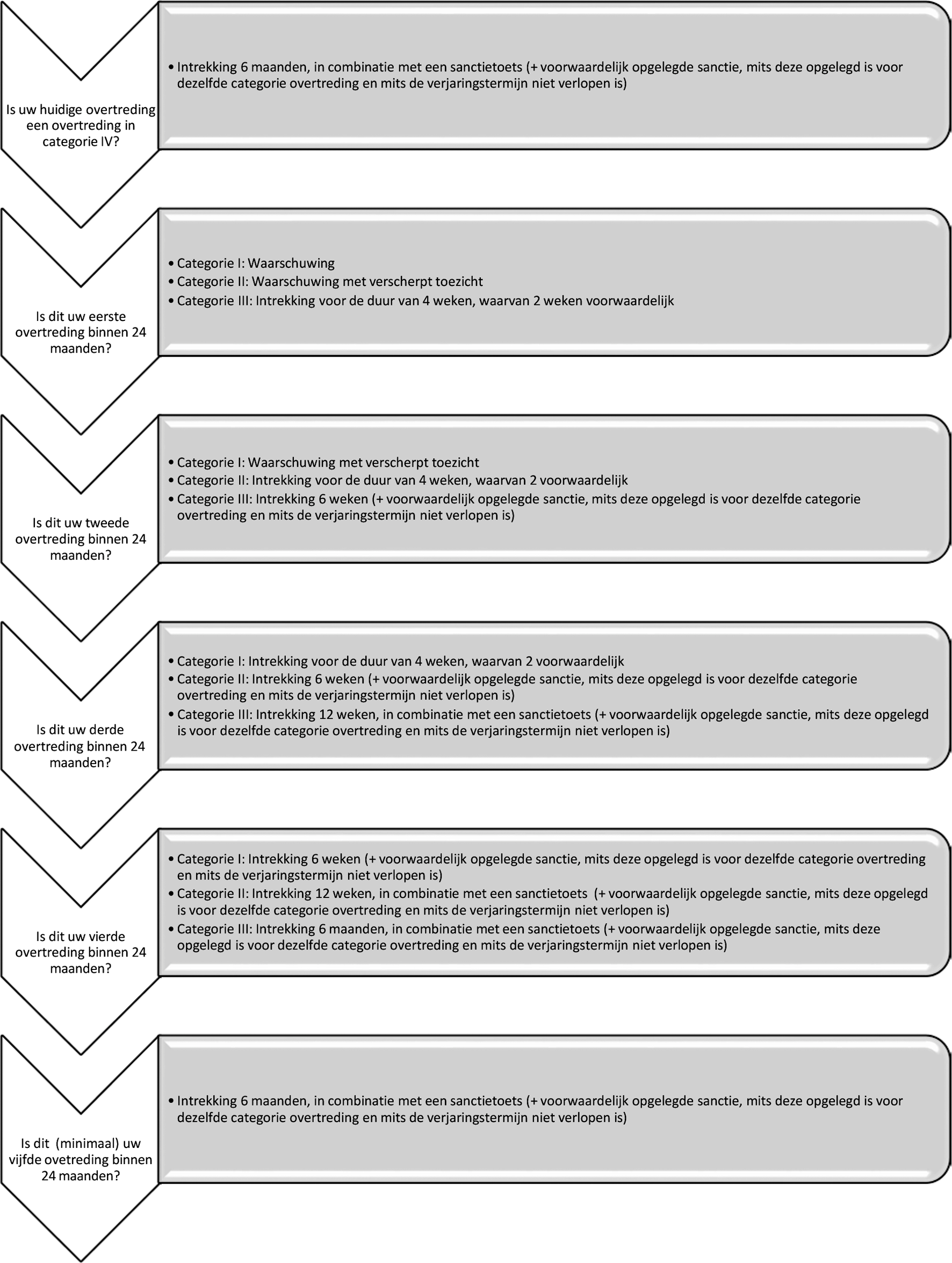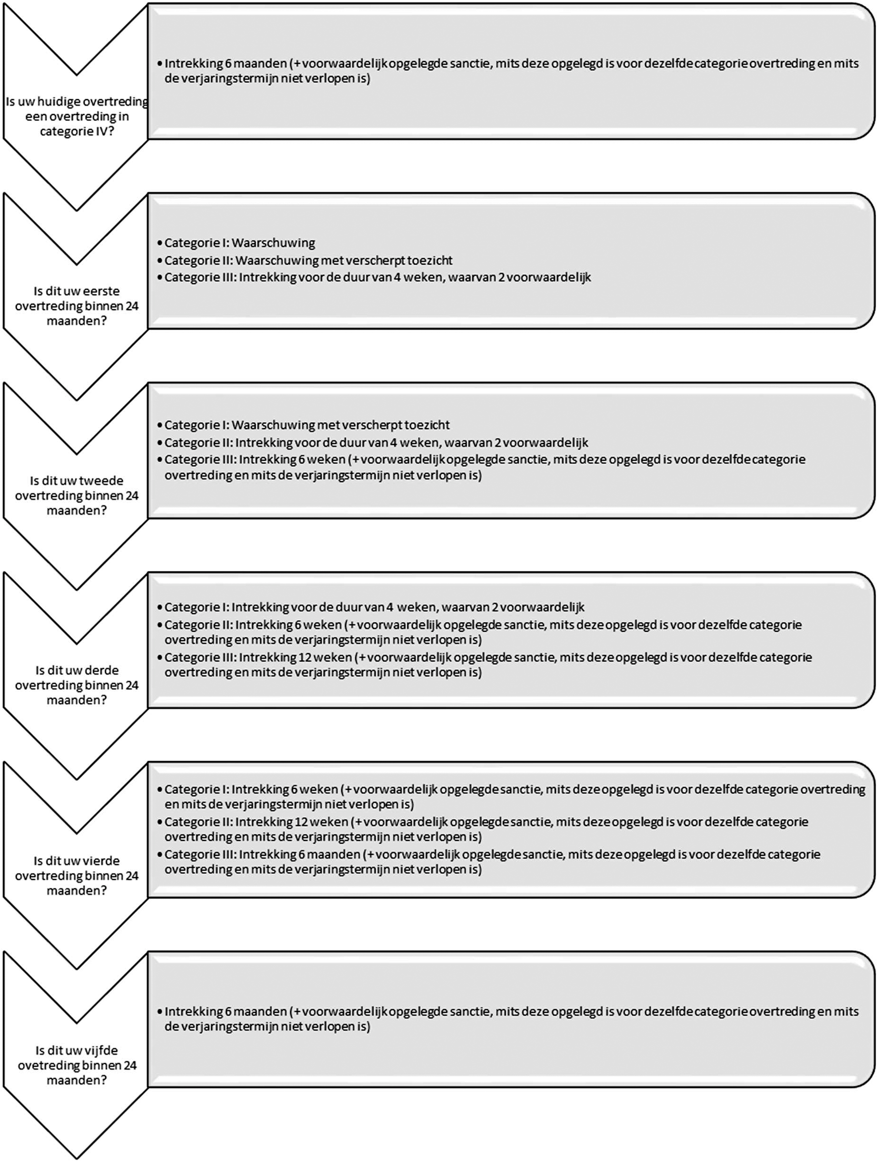 In het stroomschema op de laatste pagina worden de sancties schematisch weergegeven. In dit stroomschema is rekening gehouden met de zwaarte van overtredingen en het herhaaldelijk begaan van overtredingen. U kunt op basis van dit schema zelf nagaan welke sanctie naar verwachting wordt opgelegd.
