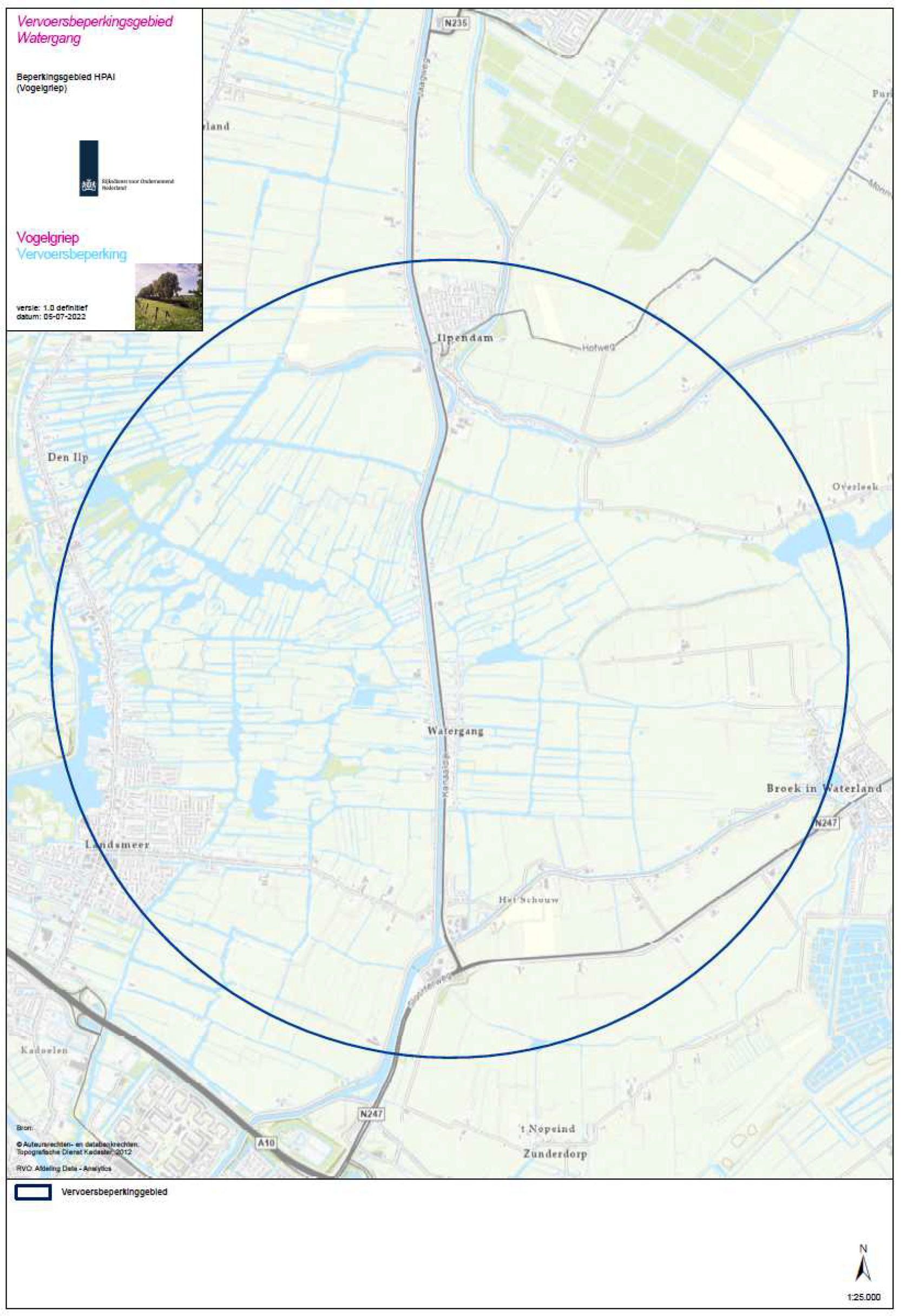 Eén van die maatregelen is het instellen van een beperkingszone die bestaat uit een beschermings- en bewakingszone rond de besmette inrichting in Watergang. In deze gebieden gelden diverse maatregelen. De verboden zijn in beide zones gelijk; verordening 2020/687 voorziet voor de bewakingszone in verhoudingsgewijs meer ruimte voor de bevoegde autoriteit om uitzonderingen op de verboden te verlenen in vergelijking met de beschermingszone. Dit vereist maatwerk door middel van ontheffingverlening.