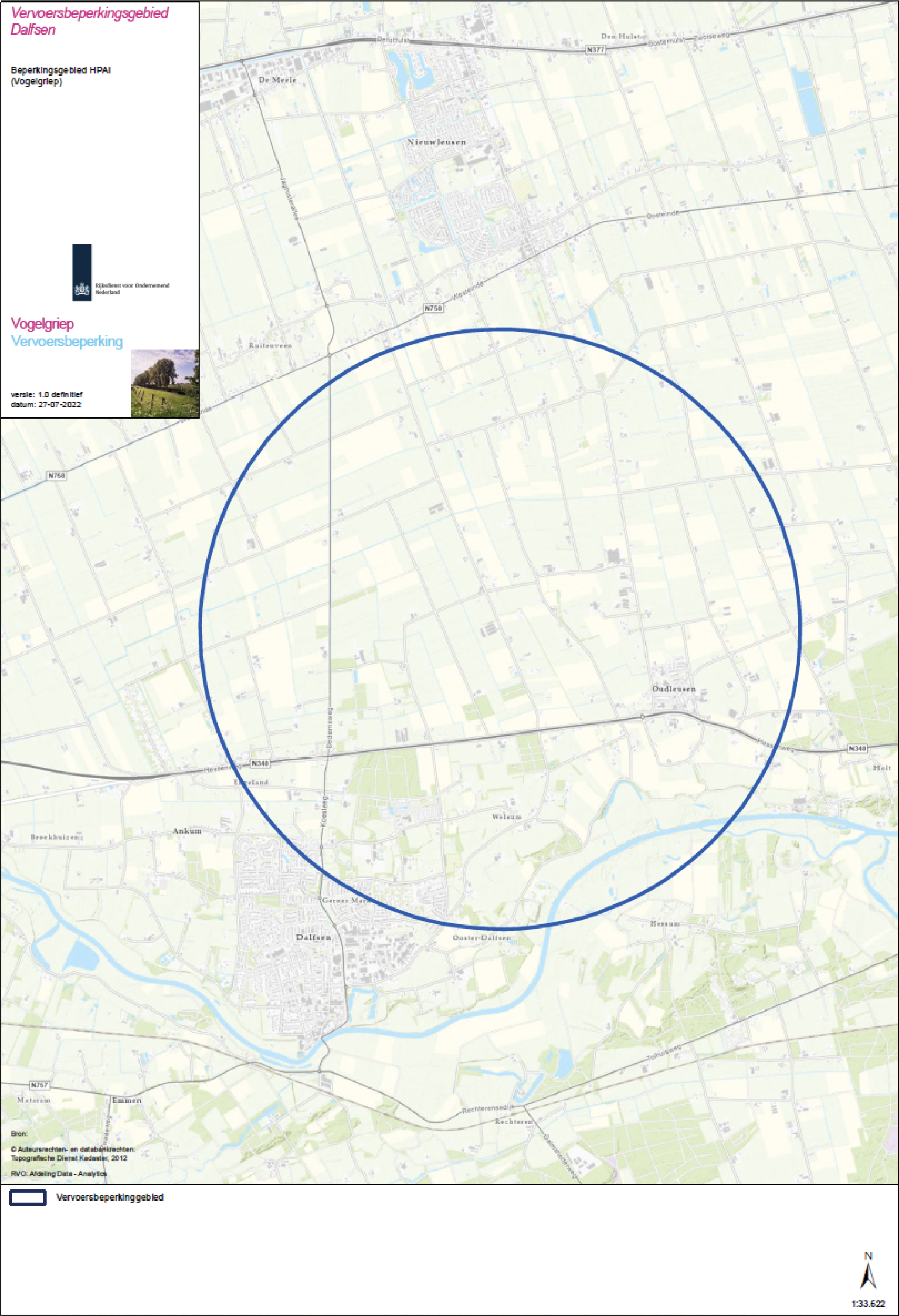 Eén van die maatregelen is het instellen van een beperkingszone die bestaat uit een beschermings- en bewakingszone rond de besmette inrichting in Dalfsen. In deze gebieden gelden diverse maatregelen. De verboden zijn in beide zones gelijk; verordening 2020/687 voorziet voor de bewakingszone in verhoudingsgewijs meer ruimte voor de bevoegde autoriteit om uitzonderingen op de verboden te verlenen in vergelijking met de beschermingszone. Dit vereist maatwerk door middel van ontheffingverlening.
