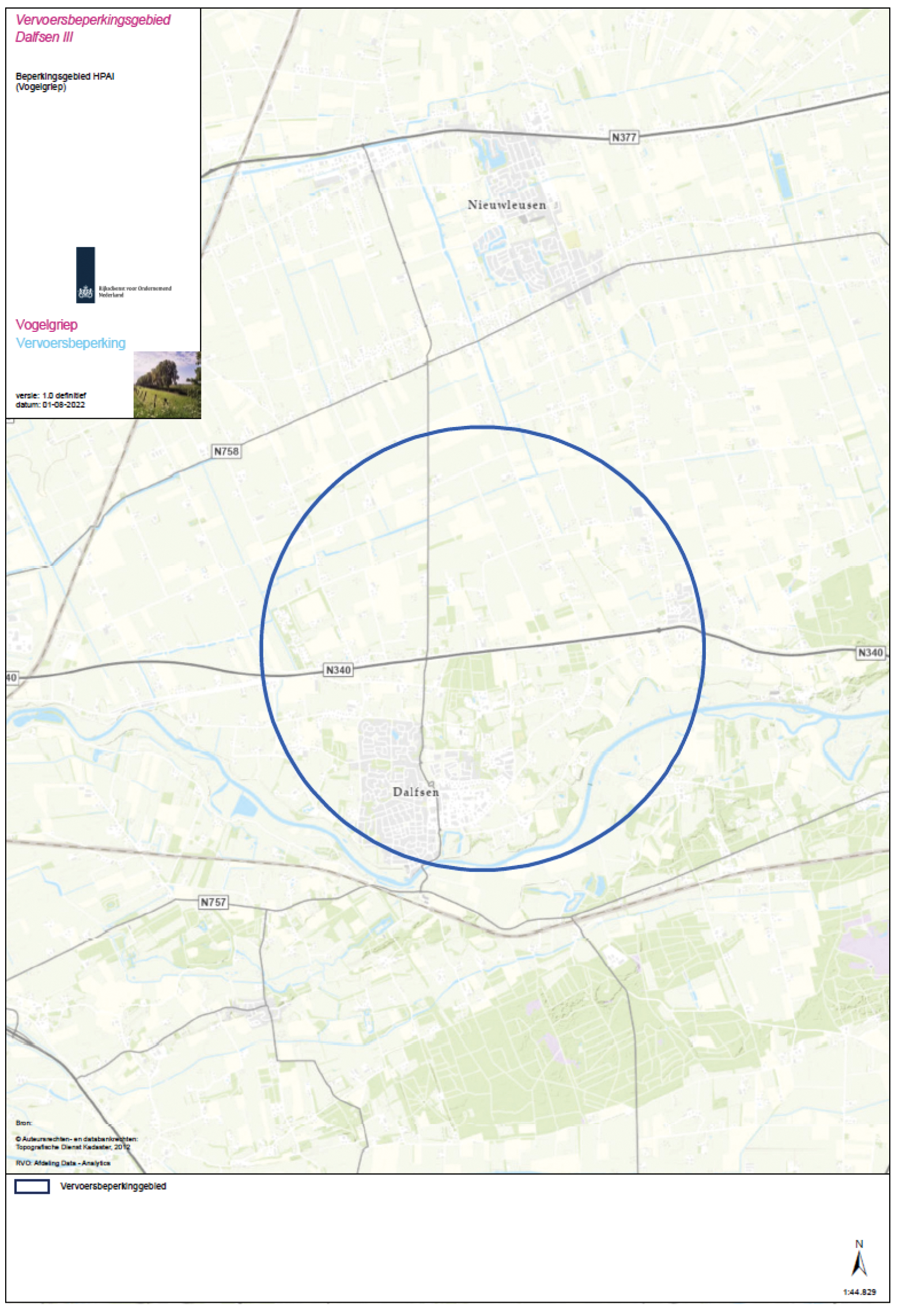 De beschermingszone is een gebied met een straal van 3 kilometer rond de besmette inrichting, zoals aan de hand van een plattegrond is aangeduid in bijlage 1. Een inzoombare, gedetailleerde kaart van die zone is beschikbaar op de website van de Rijksdienst voor Ondernemend Nederland (RVO) (https://www.rvo.nl/dierziektenviewer/). De bewakingszone is in bijlage 2 beschreven aan de hand van de wegen en waterwegen die het gebied met een straal van 10 kilometer rond de besmette inrichting begrenzen.