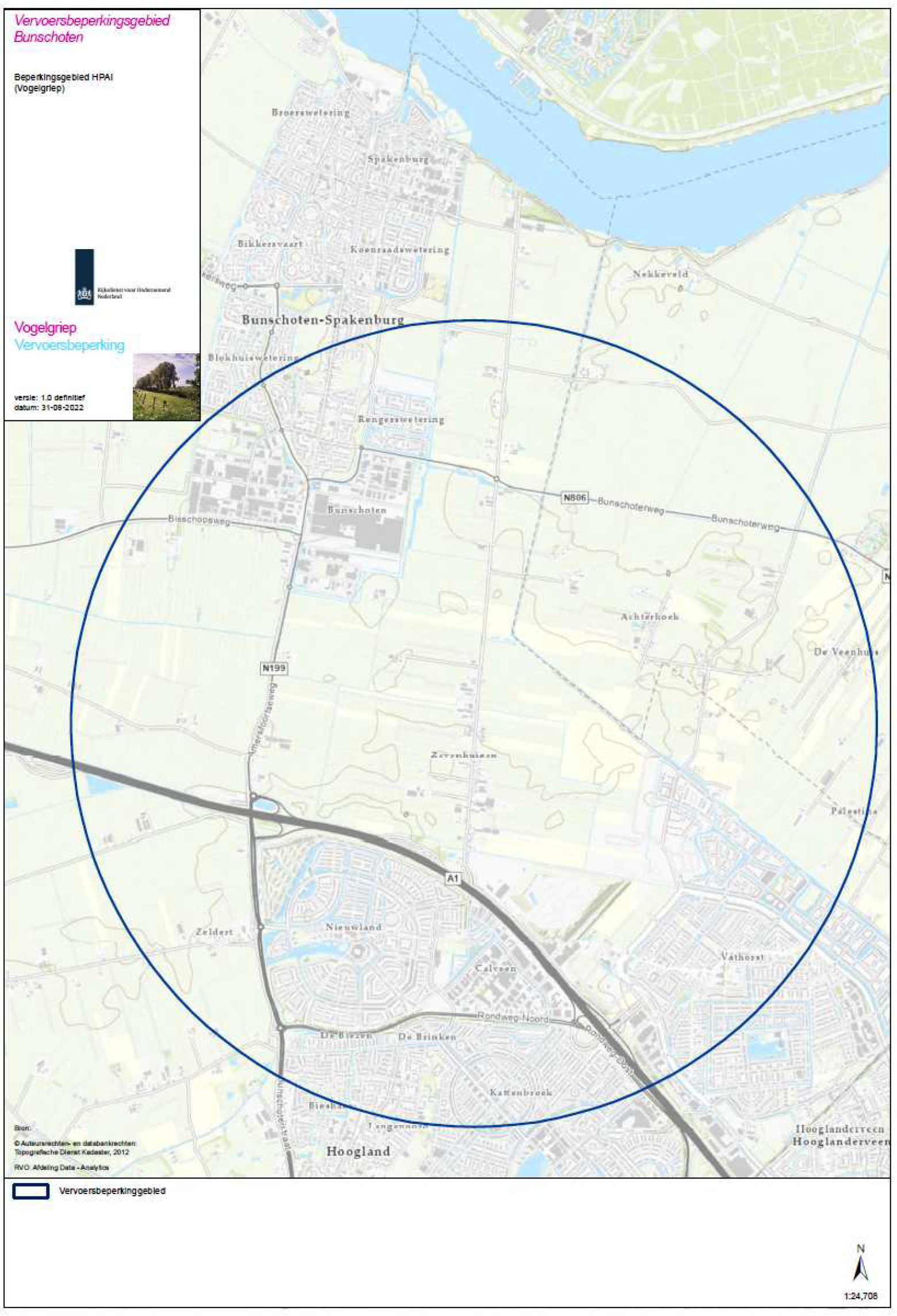 De beschermingszone is een gebied met een straal van 3 kilometer rond de besmette inrichting, zoals aan de hand van een plattegrond is aangeduid in bijlage 1. Een inzoombare, gedetailleerde kaart van die zone is beschikbaar op de website van de Rijksdienst voor Ondernemend Nederland (RVO) (https://www.rvo.nl/dierziektenviewer/). De bewakingszone is in bijlage 2 beschreven aan de hand van de wegen en waterwegen die het gebied met een straal van 10 kilometer rond de besmette inrichting begrenzen.