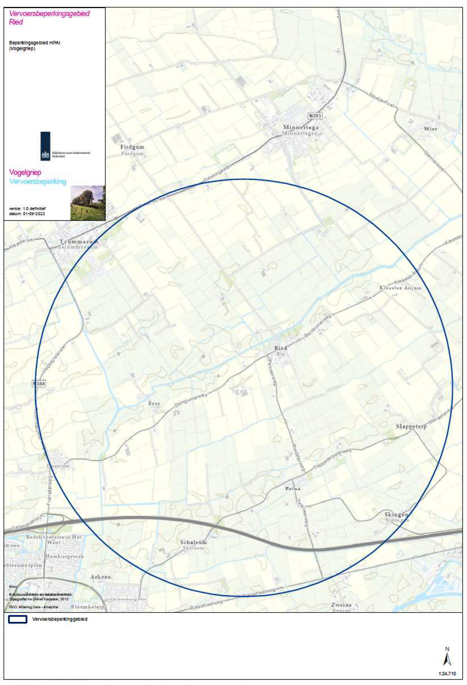 De beschermingszone is een gebied met een straal van 3 kilometer rond de besmette inrichting, zoals aan de hand van een plattegrond is aangeduid in bijlage 1. Een inzoombare, gedetailleerde kaart van die zone is beschikbaar op de website van de Rijksdienst voor Ondernemend Nederland (RVO) (https://www.rvo.nl/dierziektenviewer/). De bewakingszone is in bijlage 2 beschreven aan de hand van de wegen en waterwegen die het gebied met een straal van 10 kilometer rond de besmette inrichting begrenzen.