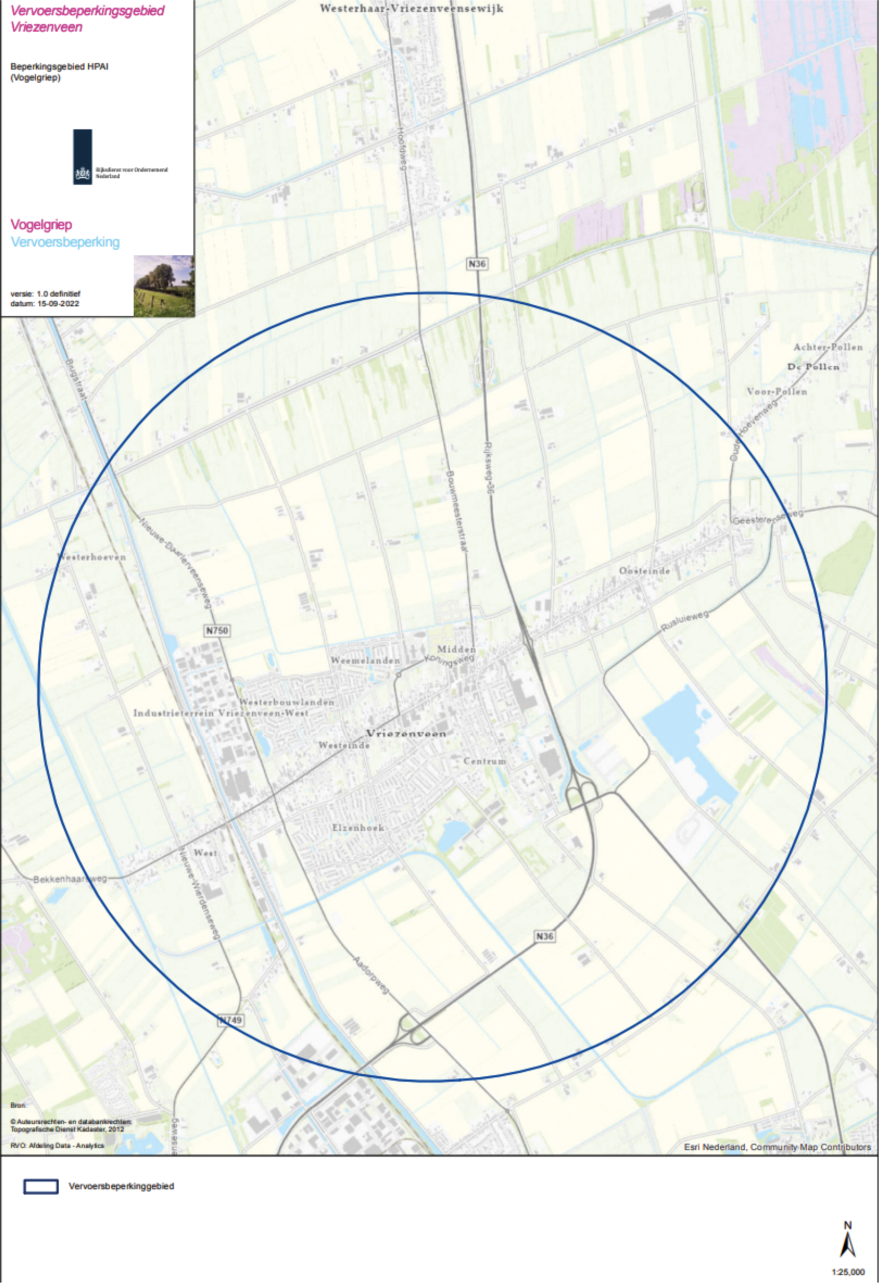 De beschermingszone is een gebied met een straal van 3 kilometer rond de besmette inrichting, zoals aan de hand van een plattegrond is aangeduid in bijlage 1. Een inzoombare, gedetailleerde kaart van die zone is beschikbaar op de website van de Rijksdienst voor Ondernemend Nederland (RVO) (https://www.rvo.nl/dierziektenviewer/). De bewakingszone is in bijlage 2 beschreven aan de hand van de wegen en waterwegen die het gebied met een straal van 10 kilometer rond de besmette inrichting begrenzen.