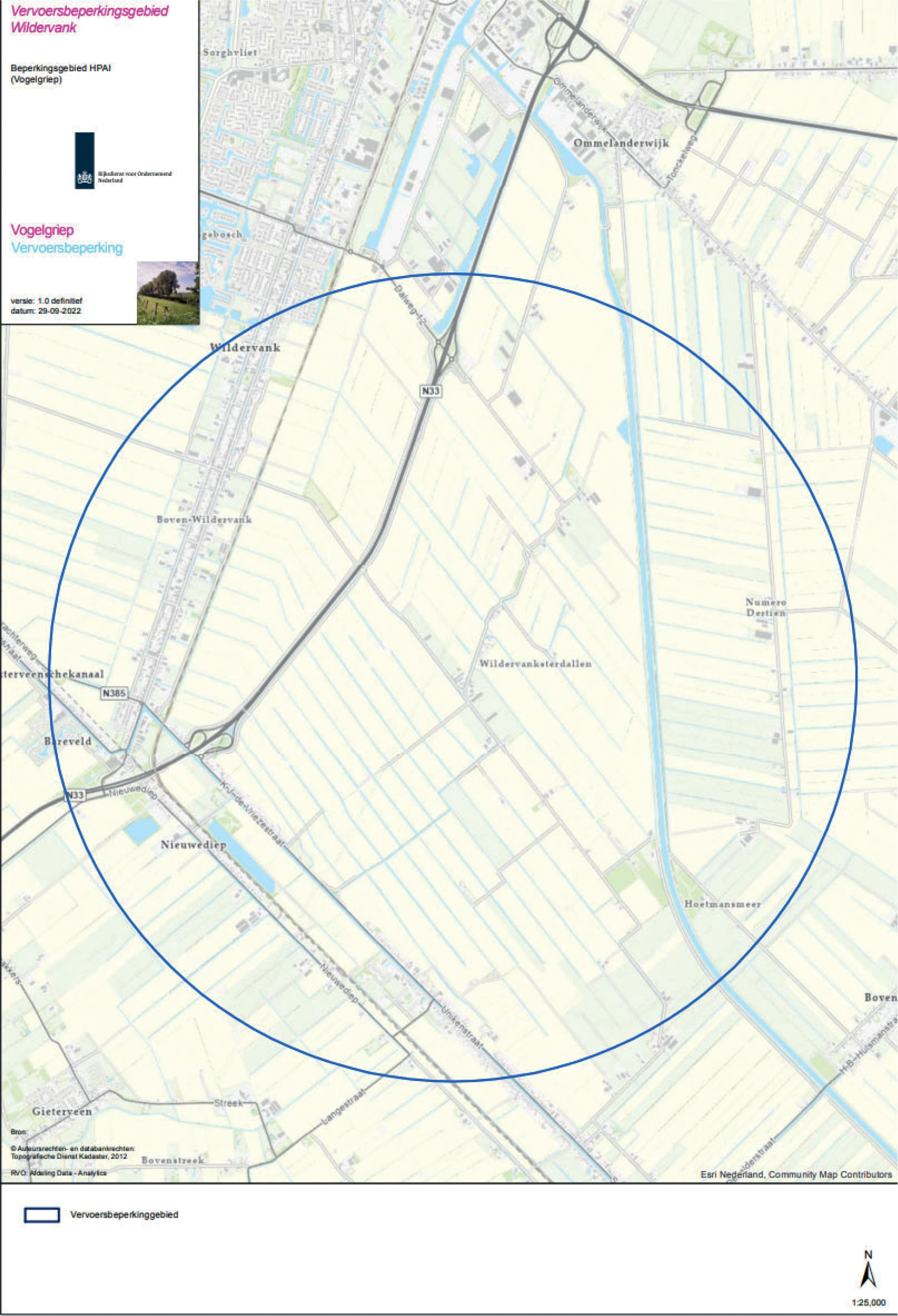De beschermingszone is een gebied met een straal van 3 kilometer rond de besmette inrichting, zoals aan de hand van een plattegrond is aangeduid in bijlage 1. Een inzoombare, gedetailleerde kaart van die zone is beschikbaar op de website van de Rijksdienst voor Ondernemend Nederland (RVO) (https://www.rvo.nl/dierziektenviewer/). De bewakingszone is in bijlage 2 beschreven aan de hand van de wegen en waterwegen die het gebied met een straal van 10 kilometer rond de besmette inrichting begrenzen.