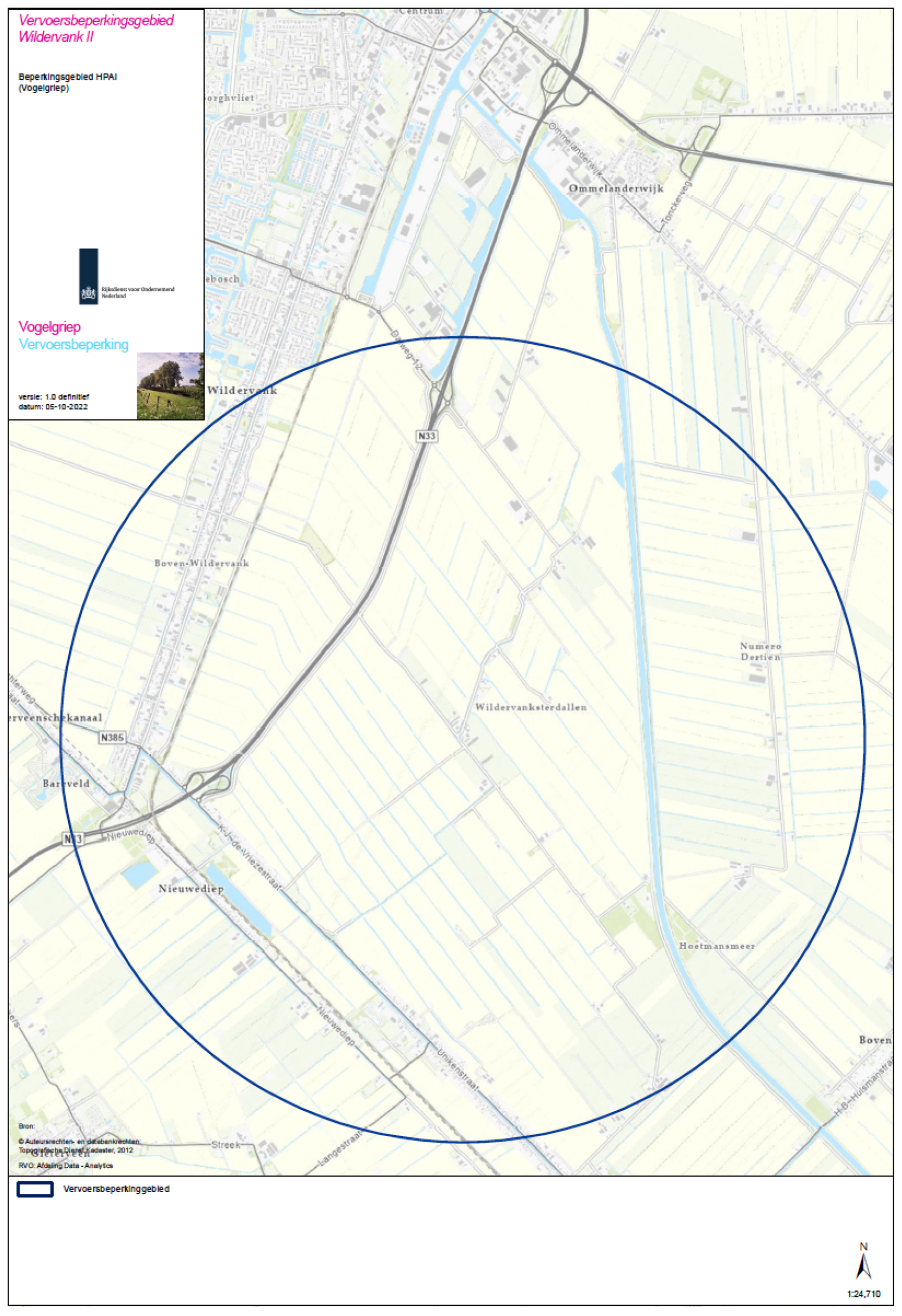 De beschermingszone is een gebied met een straal van 3 kilometer rond de besmette inrichting, zoals aan de hand van een plattegrond is aangeduid in bijlage 1. Een inzoombare, gedetailleerde kaart van die zone is beschikbaar op de website van de Rijksdienst voor Ondernemend Nederland (RVO) (https://www.rvo.nl/dierziektenviewer/). De bewakingszone is in bijlage 2 beschreven aan de hand van de wegen en waterwegen die het gebied met een straal van 10 kilometer rond de besmette inrichting begrenzen.