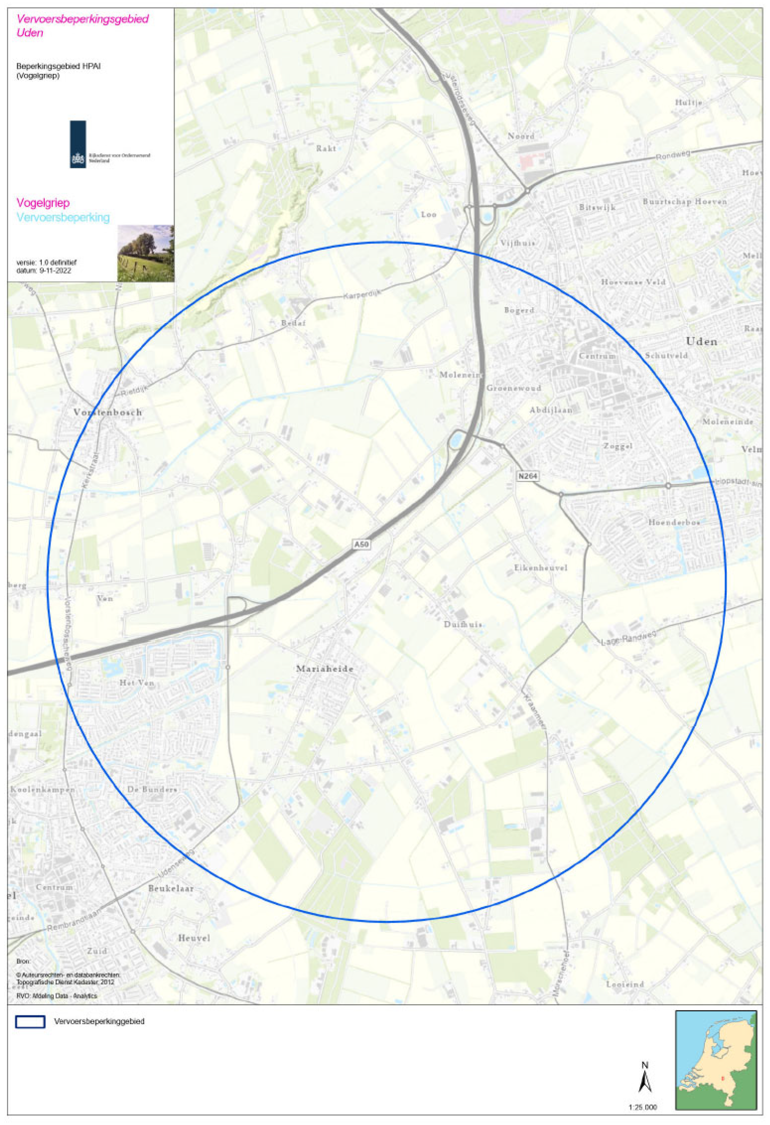 Op een inrichting in Uden in de provincie Noord-Brabant is een uitbraak geconstateerd van vermoedelijk hoogpathogene aviaire influenza (HPAI), ofwel vogelgriep. HPAI is een besmettelijke dierziekte, die tot hoge sterftecijfers kan leiden bij vogels en kan worden overgedragen op mensen (een zogenoemde zoönose). Het isoleren van de gevonden besmettingshaard en het voorkomen van verdere verspreiding van de ziekte is daarom van het grootste belang.