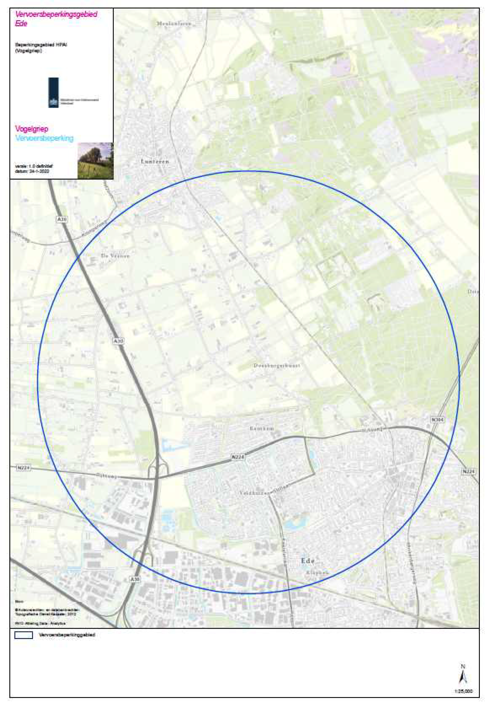 beschermings- en bewakingszone rond de besmette inrichting in Ede. In deze gebieden