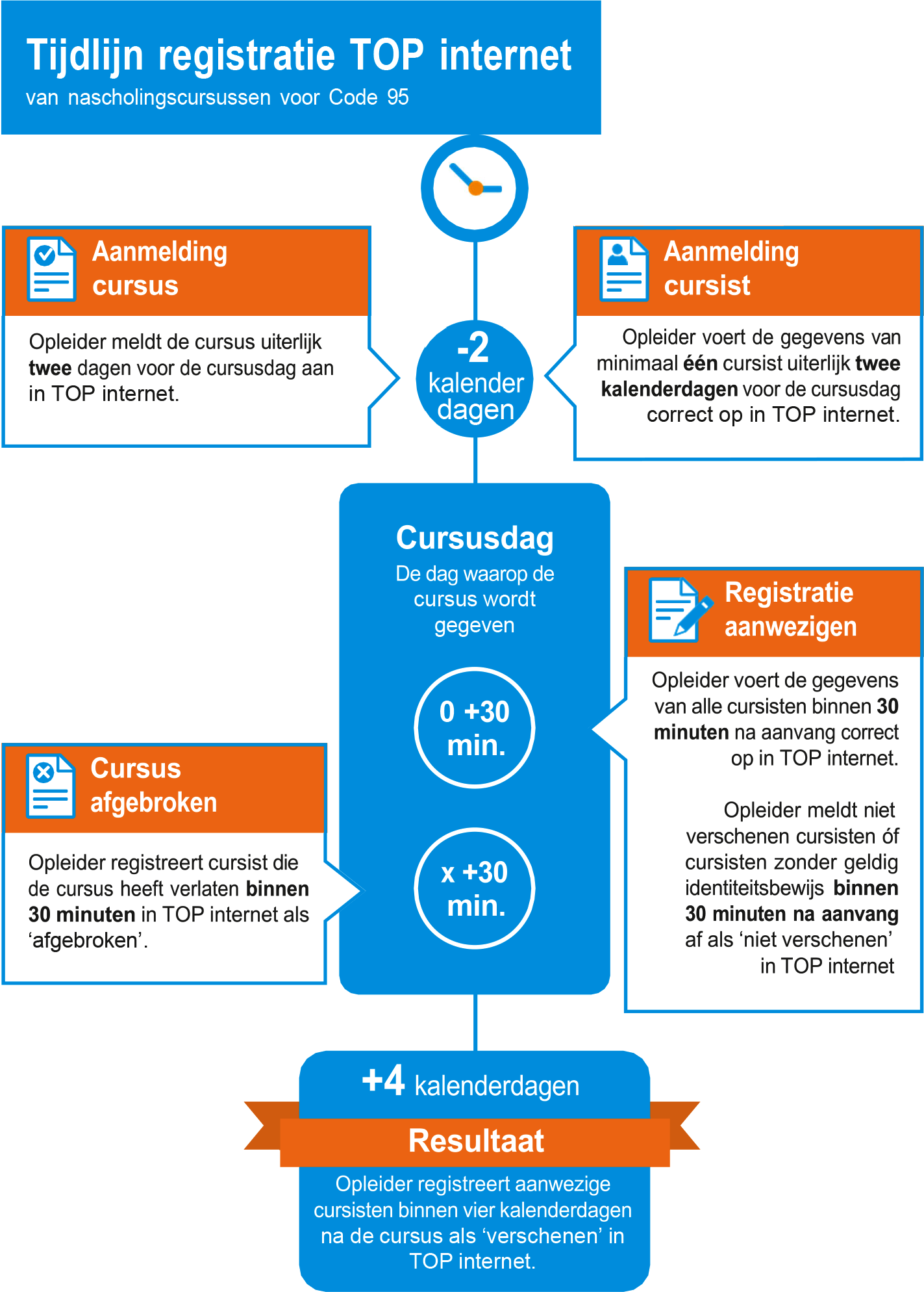 Om als opleidingsinstituut erkend te worden en blijven voor het verzorgen van nascholing voor de code 95 moet het in Nederland staan ingeschreven bij de Kamer van Koophandel. Staat het opleidingsinstituut niet langer ingeschreven bij de Kamer van Koophandel? Dan trekt het CBR de erkenning per direct in.