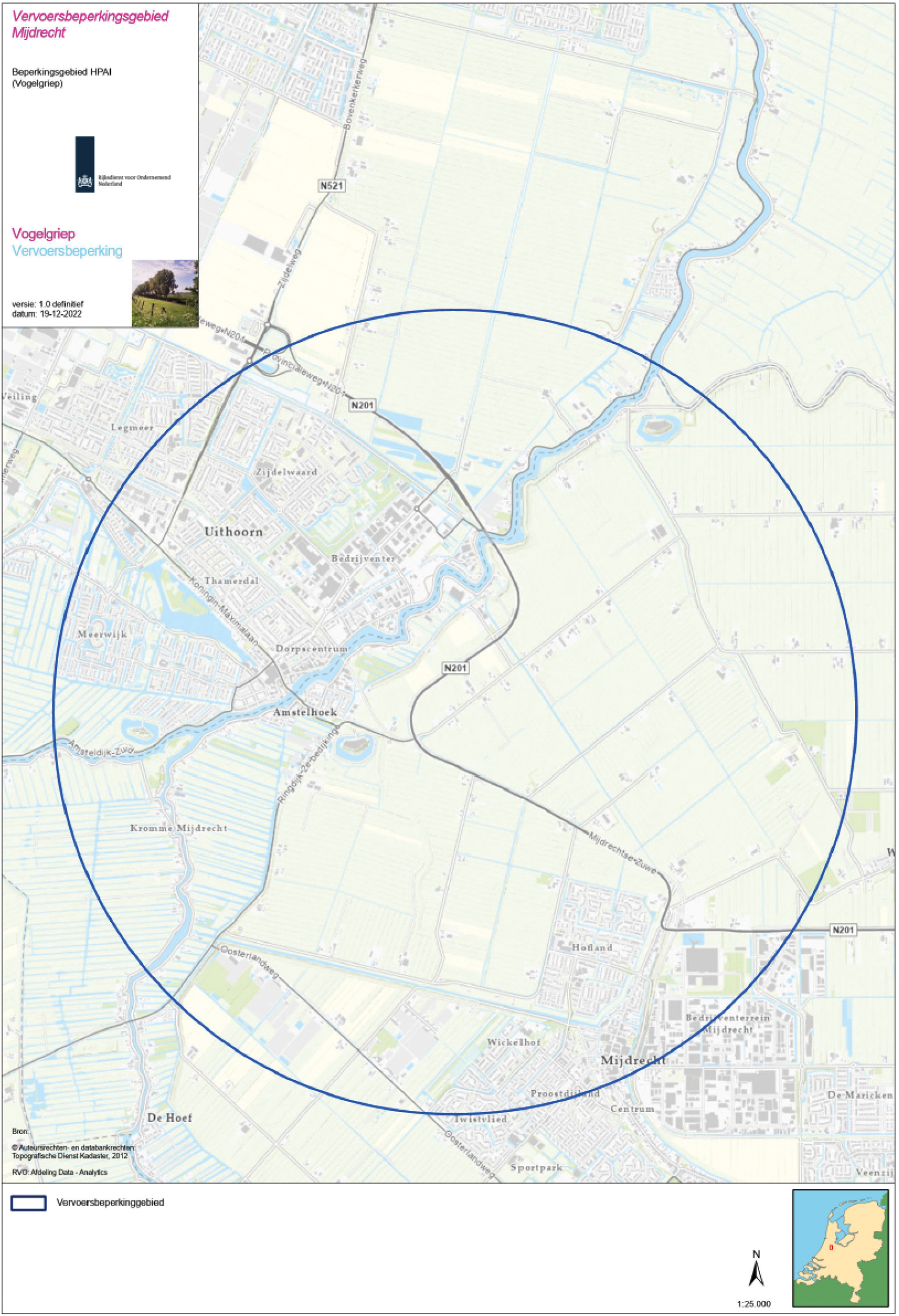 Eén van die maatregelen is het instellen van een beperkingszone die bestaat uit een beschermings- en bewakingszone rond de besmette inrichting in Mijdrecht. In deze gebieden gelden diverse maatregelen. De verboden zijn in beide zones gelijk; verordening 2020/687 voorziet voor de bewakingszone in verhoudingsgewijs meer ruimte voor de bevoegde autoriteit om uitzonderingen op de verboden te verlenen in vergelijking met de beschermingszone. Dit vereist maatwerk door middel van ontheffingverlening.