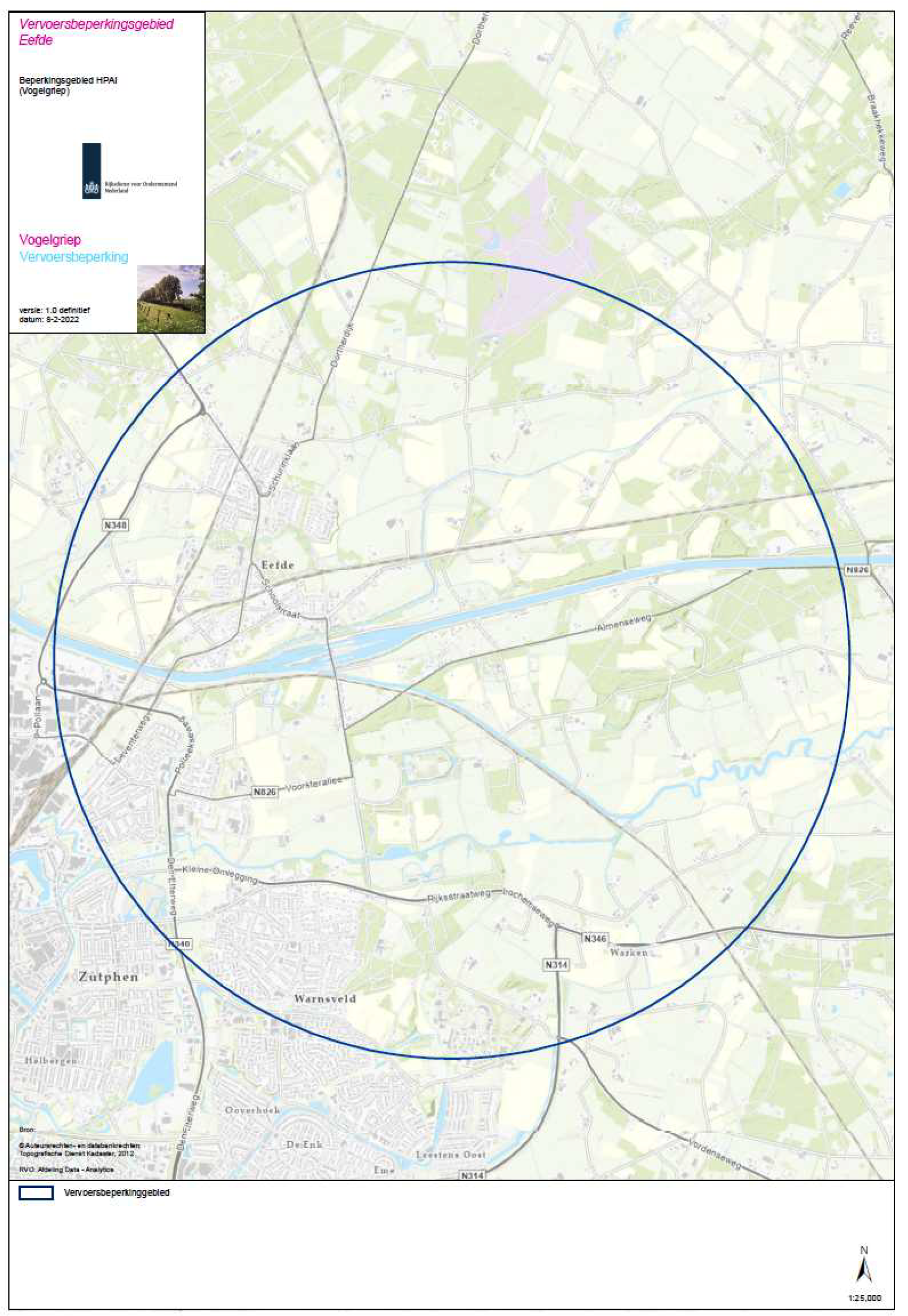 beschermings- en bewakingszone rond de besmette inrichting in Eefde. In deze gebieden