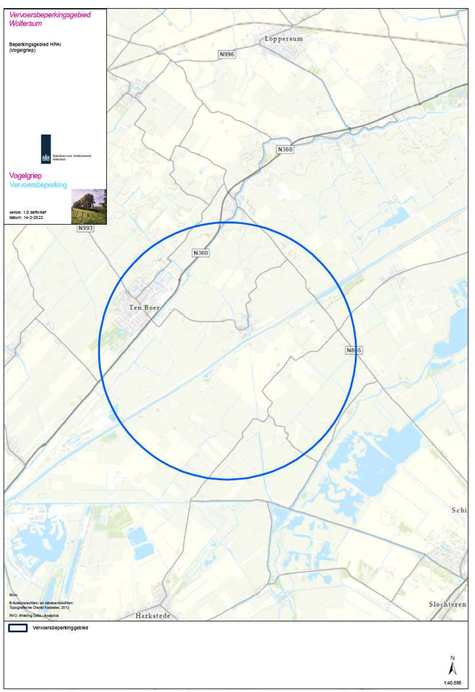 beschermings- en bewakingszone rond de besmette inrichting in Woltersum. In deze gebieden