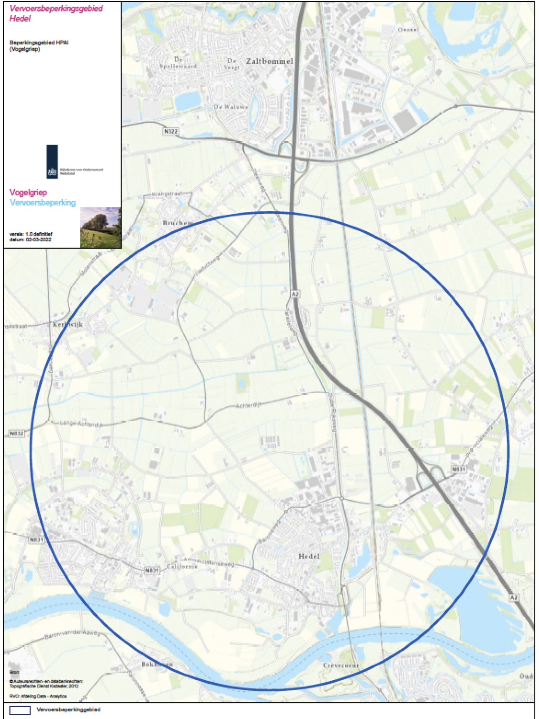 beschermings- en bewakingszone rond de besmette inrichting in Hedel. In deze gebieden