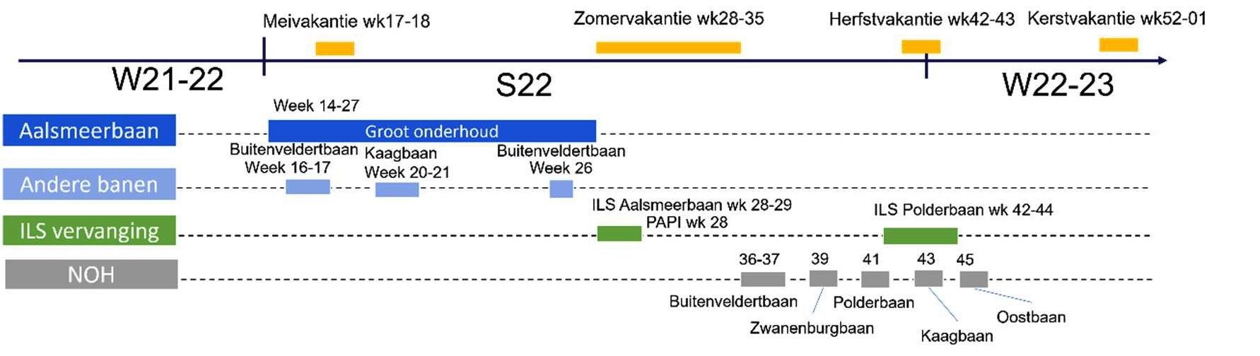 De Aalsmeerbaan is van 4 april tot en met medio juli 2022 in groot onderhoud. Hierdoor is de start- en landingsbaan niet beschikbaar voor vliegverkeer. Het vliegverkeer dat normaal zou starten vanaf de Aalsmeerbaan of zou landen op deze baan, zal in deze periode meer gebruik maken van de Buitenveldertbaan, de Schiphol-Oostbaan en de Kaagbaan. Omdat de Aalsmeerbaan ’s nachts sowieso gesloten is, heeft dit geen gevolgen voor nachtvluchten.
