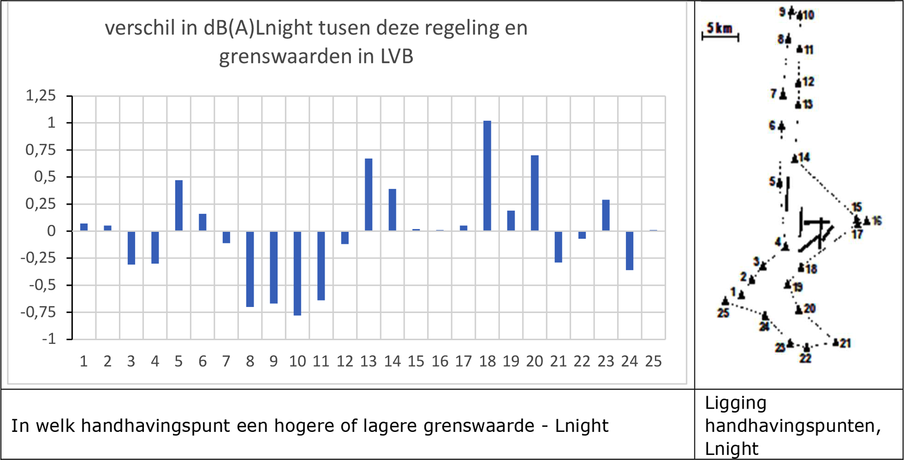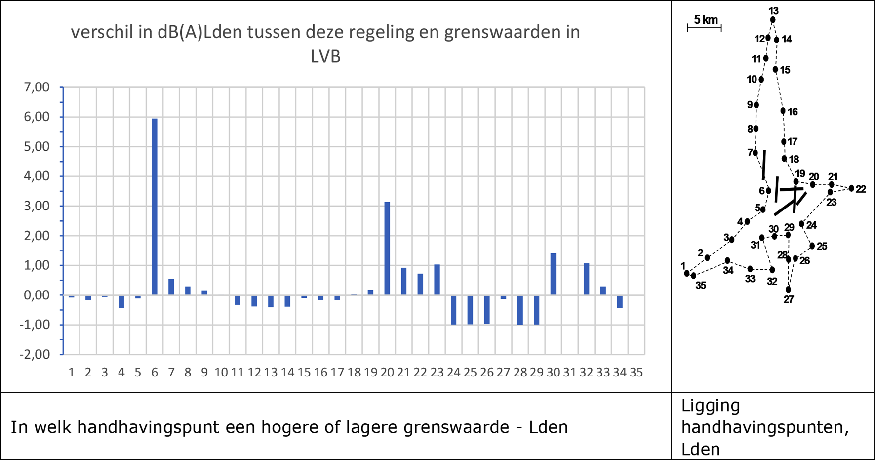 In de onderstaande figuren zijn de verschillen tussen de grenswaarden in de onderhavige regeling en de grenswaarden zonder groot baanonderhoud aan de Aalsmeerbaan aangegeven. Een staafje boven de nullijn geeft aan met hoeveel dB(A) de grenswaarde is verhoogd ten behoeve van de onderhavige werkzaamheden, een staafje onder de nullijn geeft de verlaging aan.